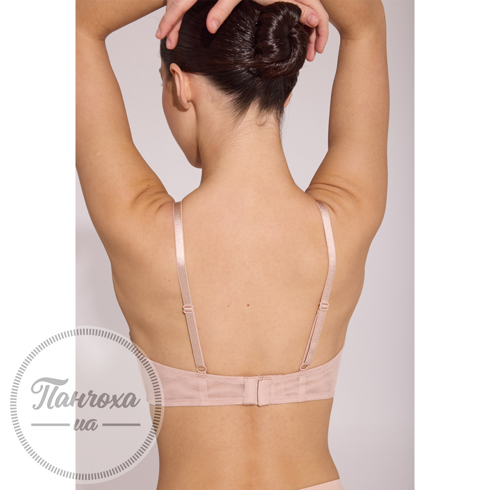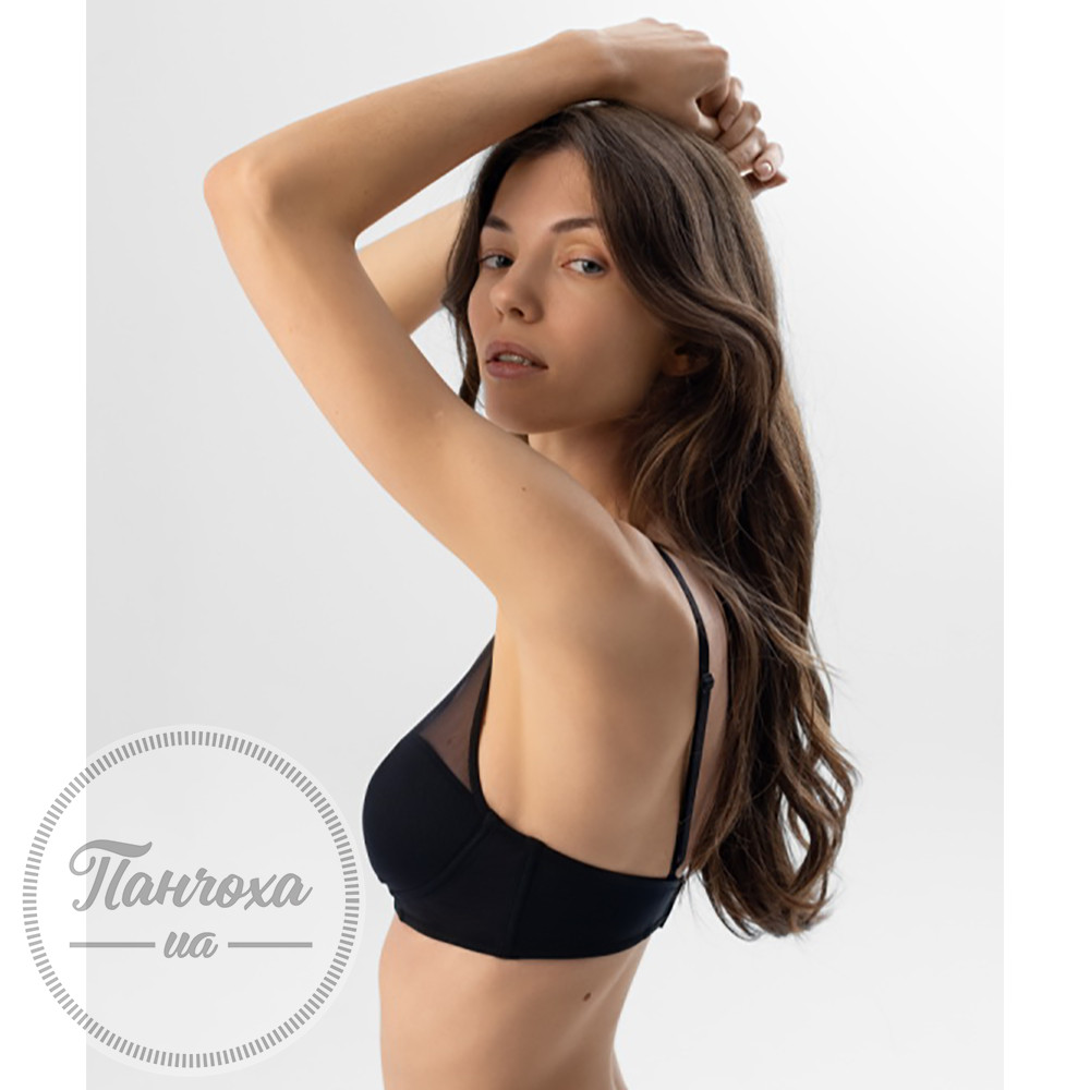 Комфортний напівм'який бюстгальтер з тонкими поролоновими сшитими чашками, що м'яко, але натурально підримує груди. Бюст стильно декорований сіткою у формі майки/топу, що є елементом дизайну та додаткової фіксації. Не має кісточок, але підтримується боковими м’якими пластинами.