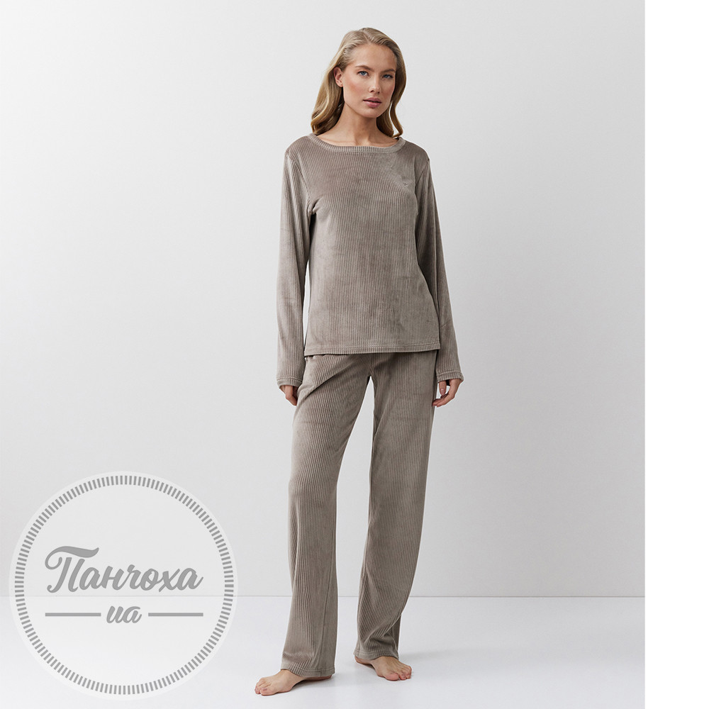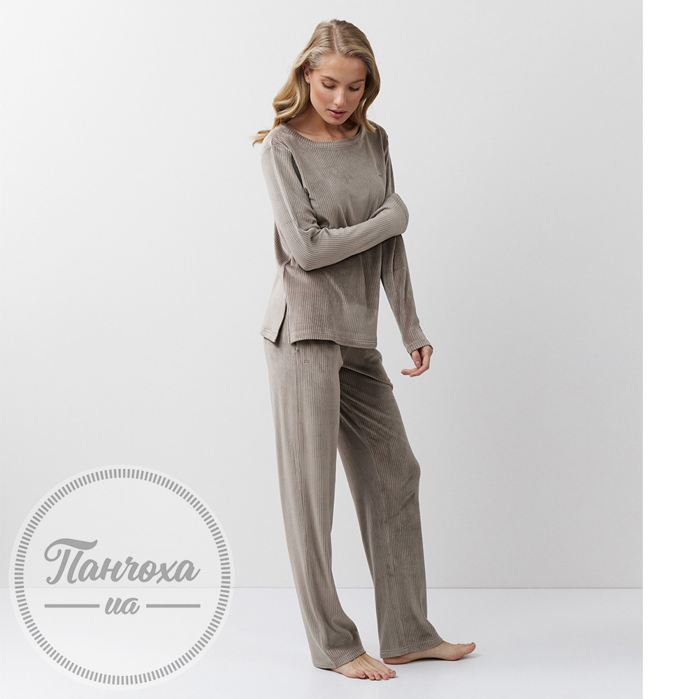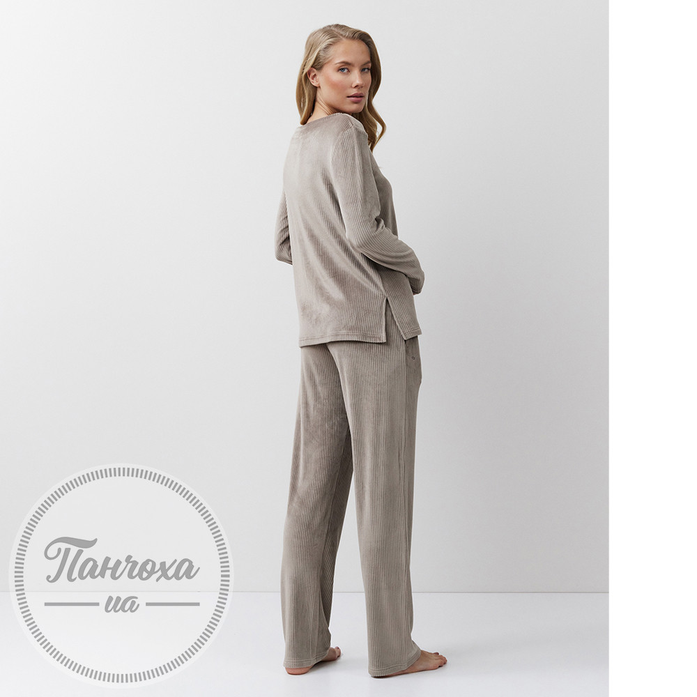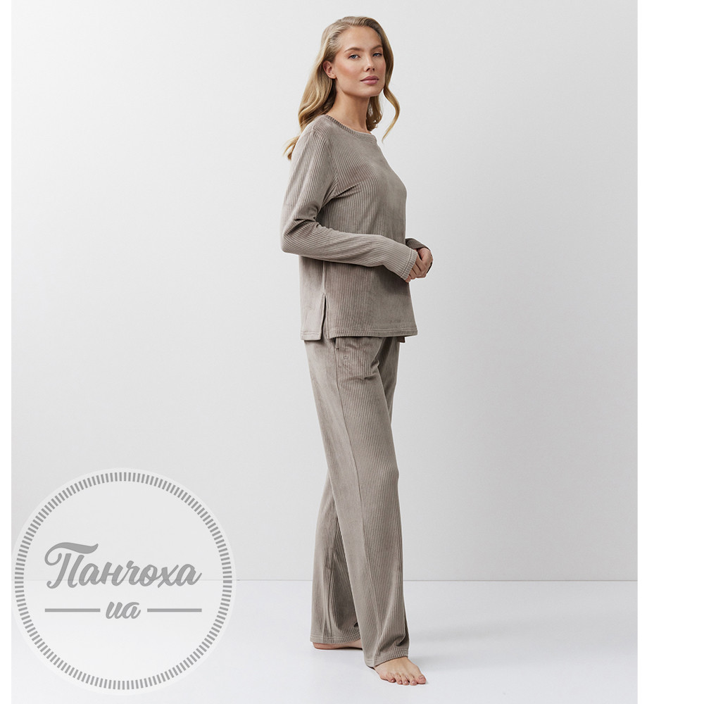 Розкішний та бездоганно елегантний комплект для відпочинку. Виготовлено з високоякісного тонкого ребристого поліестеру з еластаном, що забезпечує м'яку та еластичну посадку. Верх має вільний, прямий силует з вирізом-човником для вишуканого штриха. Невелика вишита корона на грудях додає витонченості. Штани мають зручний прямий крій, доповнені бічними кишенями для функціональності. Зріст моделі 175 см, розмір S.