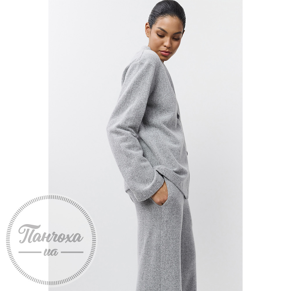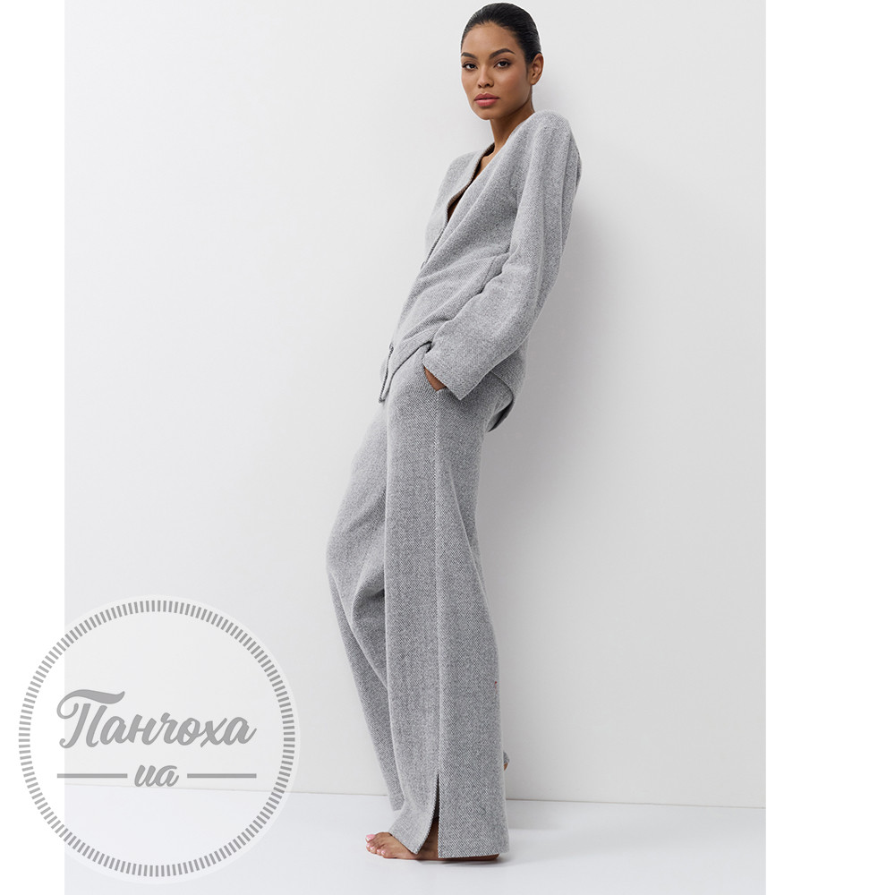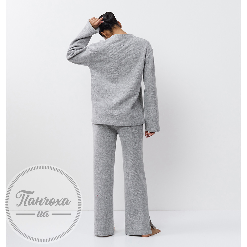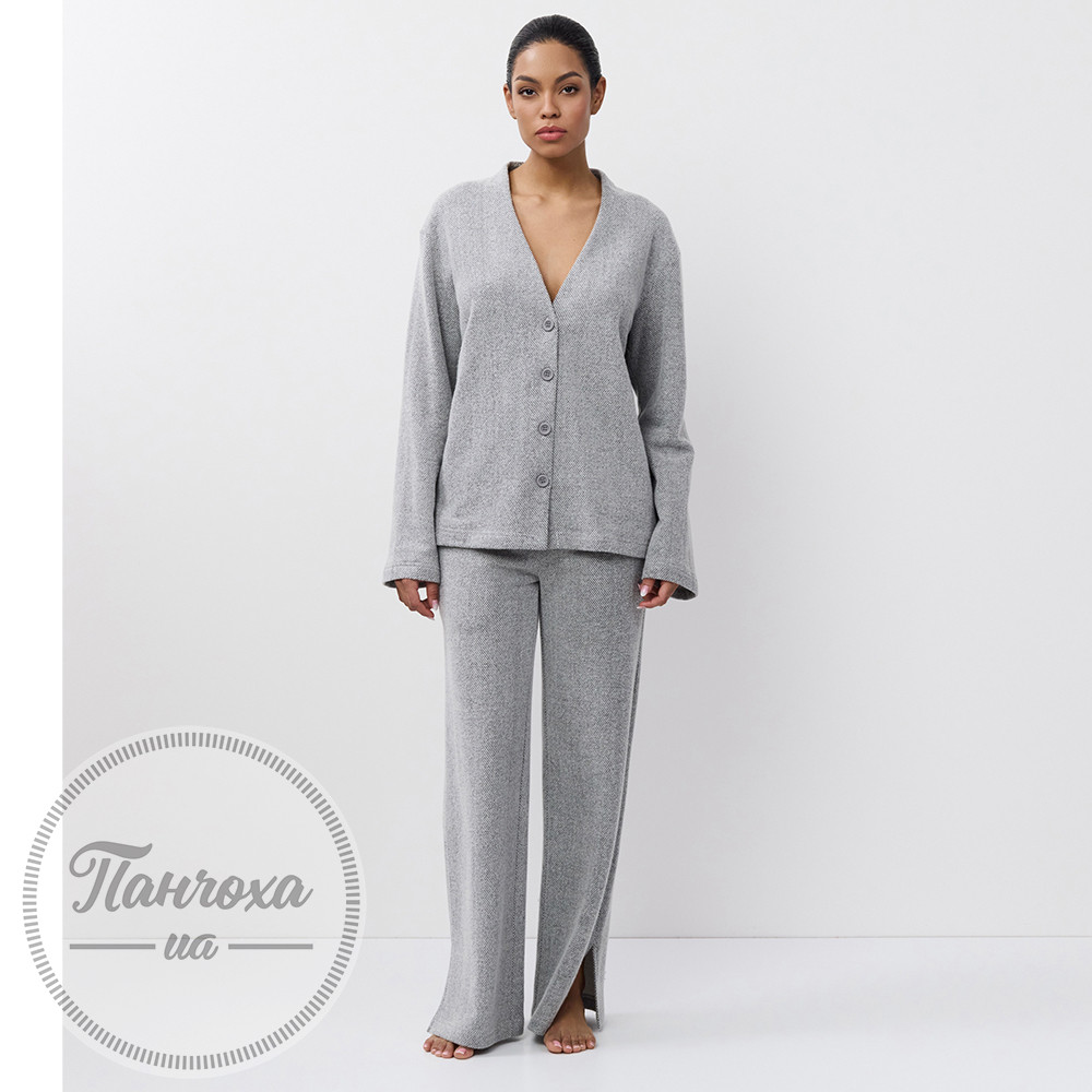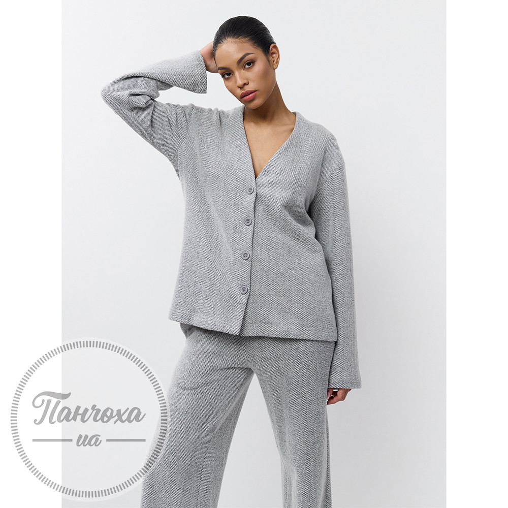 Елегантний комплект для дому з текстурою “під в’язання”. Виготовлений із м’якої та еластичної бавовняної тканини з текстурою “під в’язання”. Верх із V-подібним вирізом та застібкою на гудзики. Рукави повної довжини вільного крою.