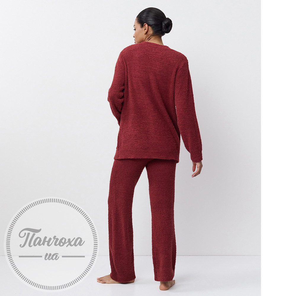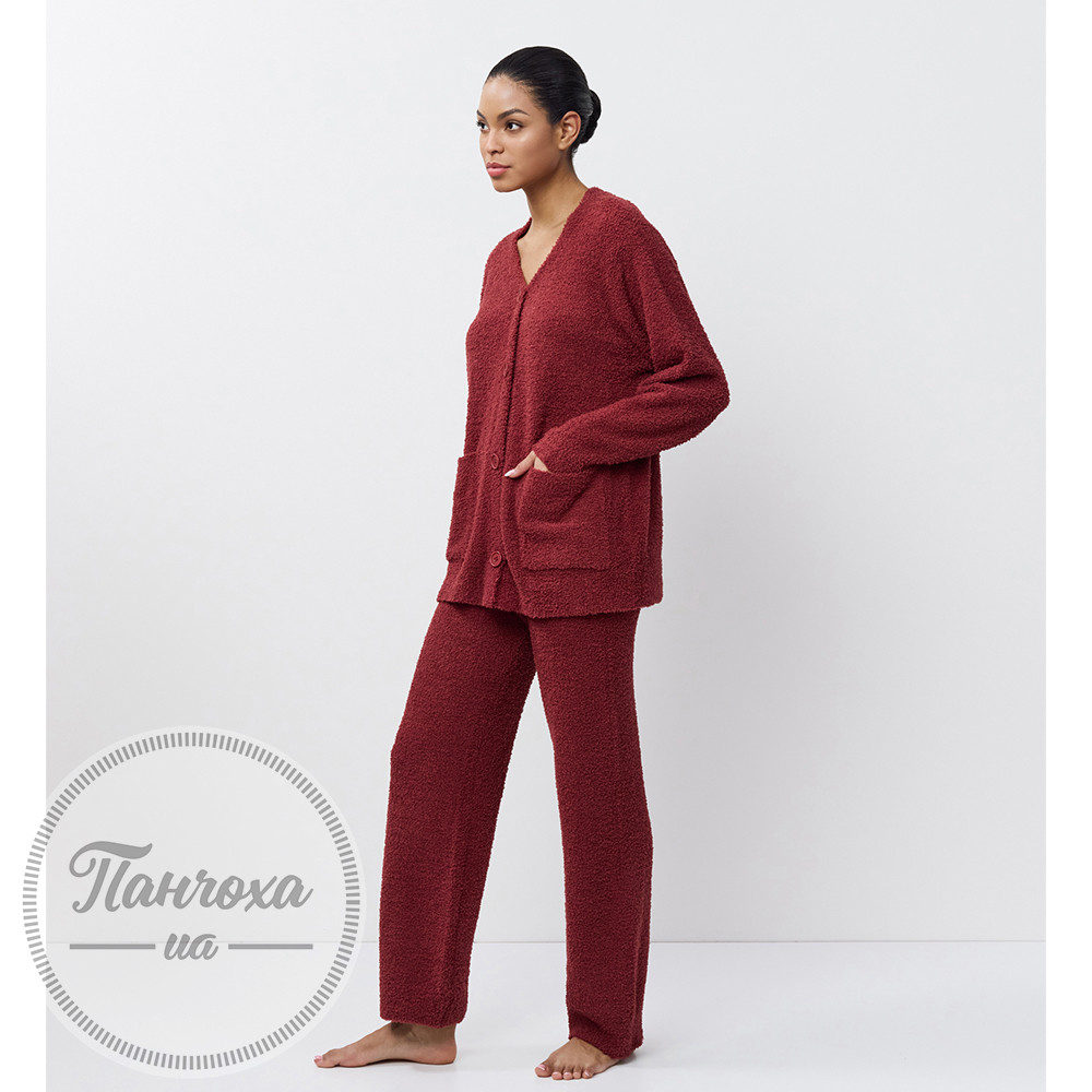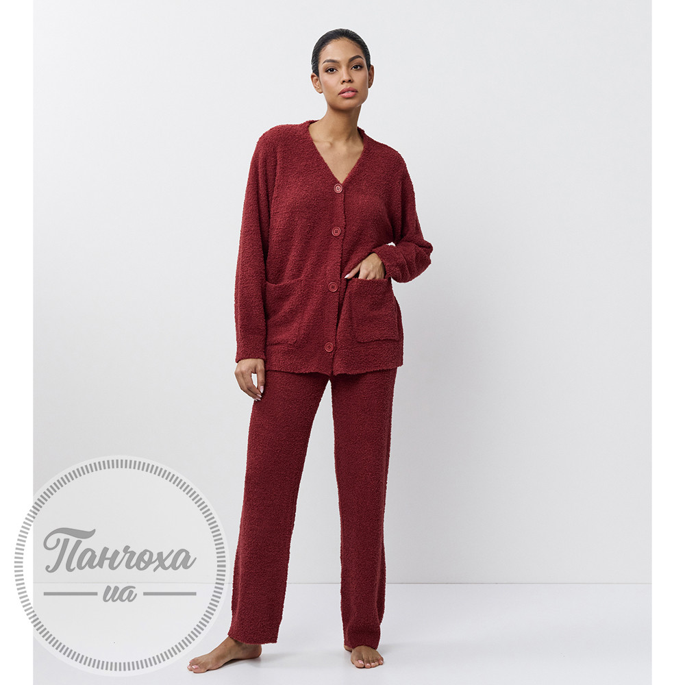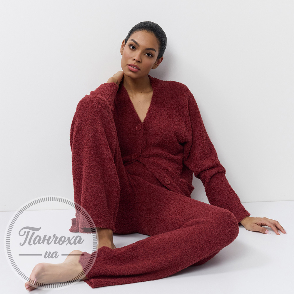 Затишний в’язаний комплект для дому у стилі oversizeВиготовлений із м’якої в’язаної поліестерної тканини з еластаном для додаткової гнучкості.Колір — бордовий.Верх — подовженого oversize крою.V-подібний виріз горловини із застібкою на гудзики.Подовжені рукави повної довжини для додаткового комфорту.Накладні кишені спереду створюють відчуття затишку.