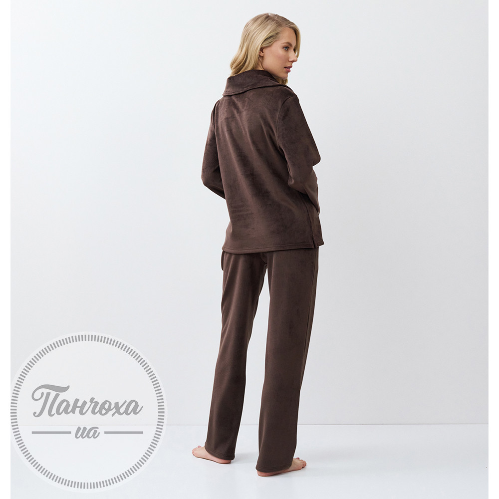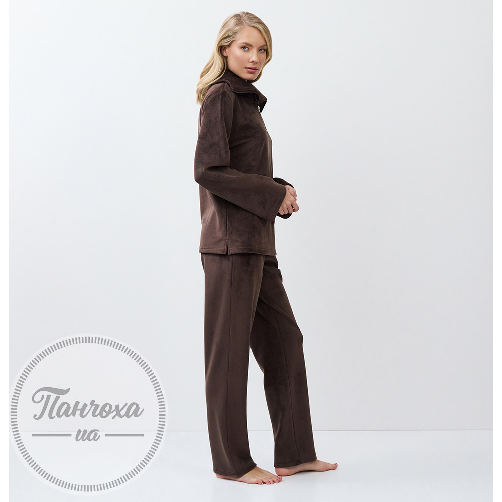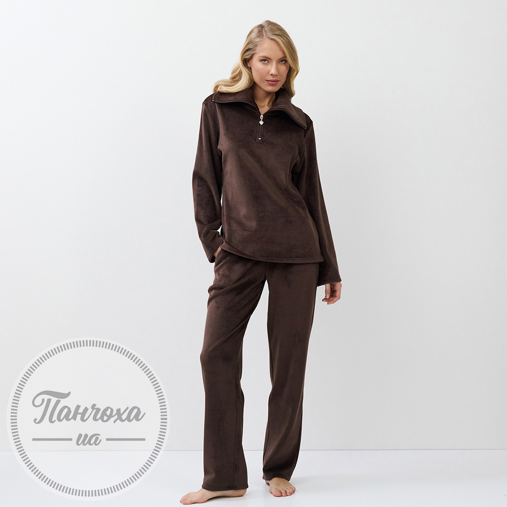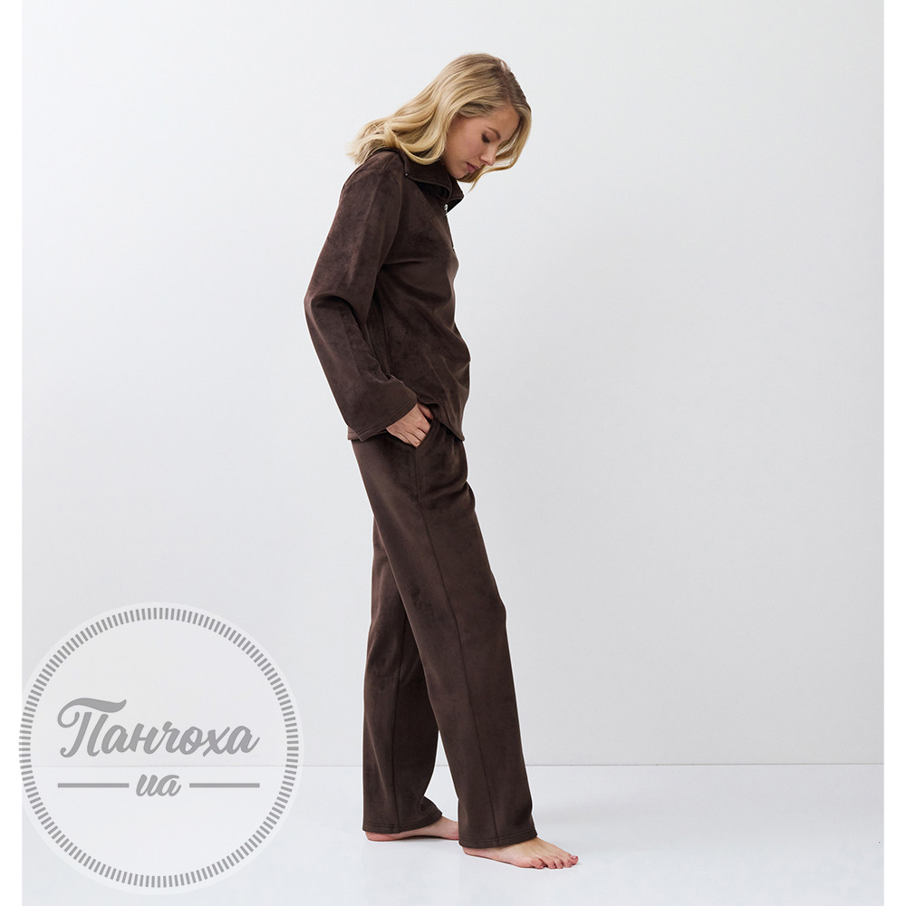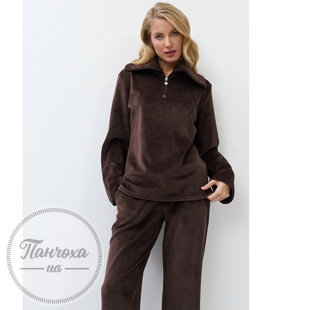 Має дрібноребристу текстуру з вишуканим ефектом замші.Колір — насичений шоколадний.Верх — вільного крою з довгими рукавами.Високий комір із напівблискавкою у формі серця кольору хром — для зручності та стильного акценту.Штани — прямого крою для комфорту та елегантності.Бічні кишені додають практичності.Еластичний пояс забезпечує легку та зручну посадку.Зріст моделі 175 см, розмір S.