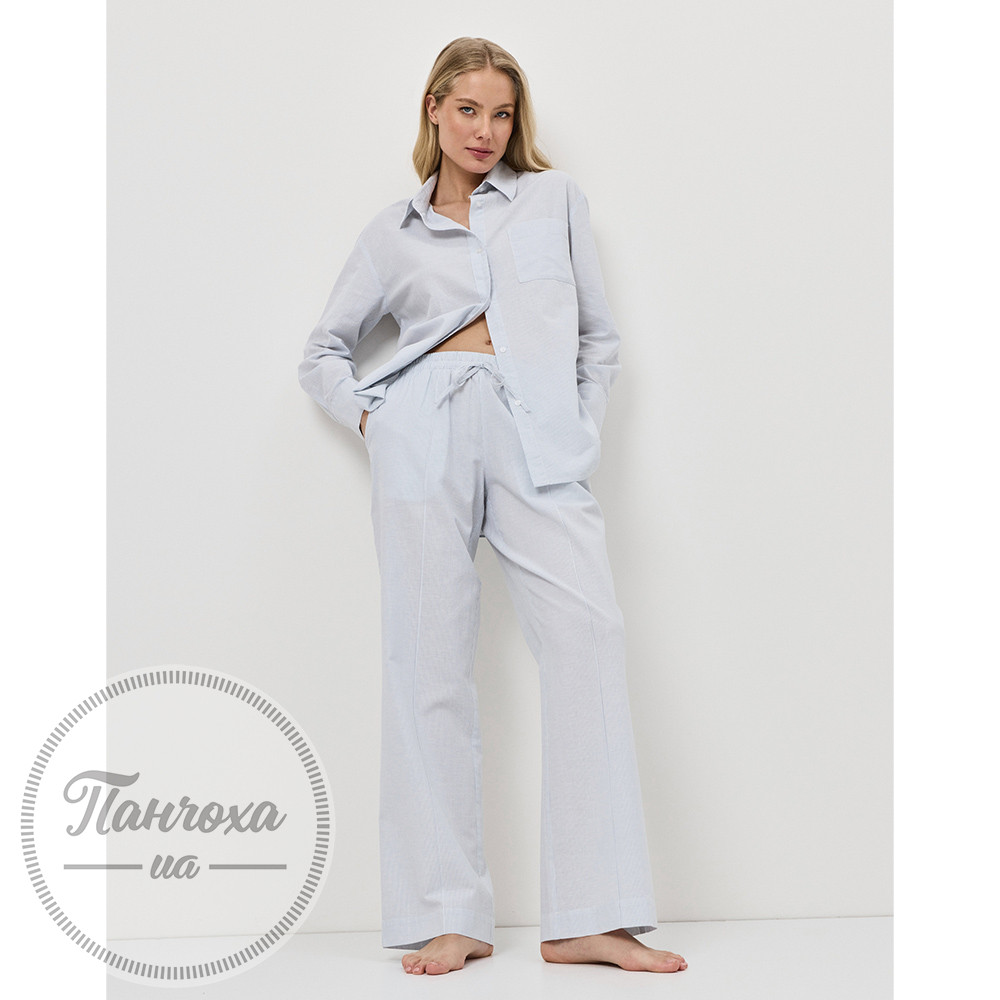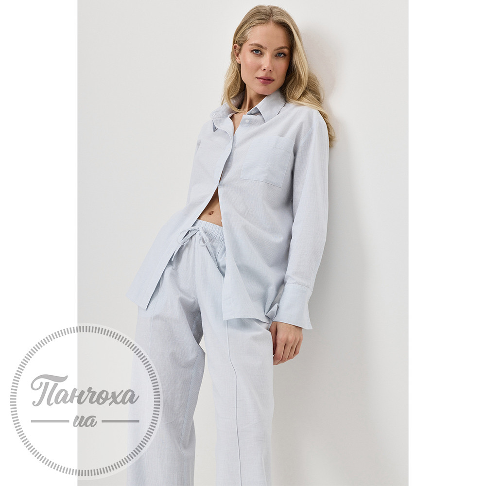 Сорочка має гострий комір, застібку на ґудзики спереду, нагрудну кишеню та широкі манжети. Штани довгі, з еластичним поясом, шнурком та боковими кишенями. Зріст моделі 175 см, розмір S.