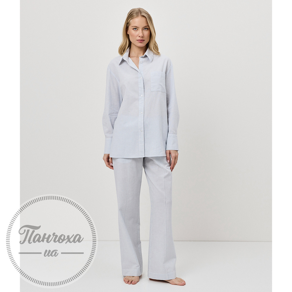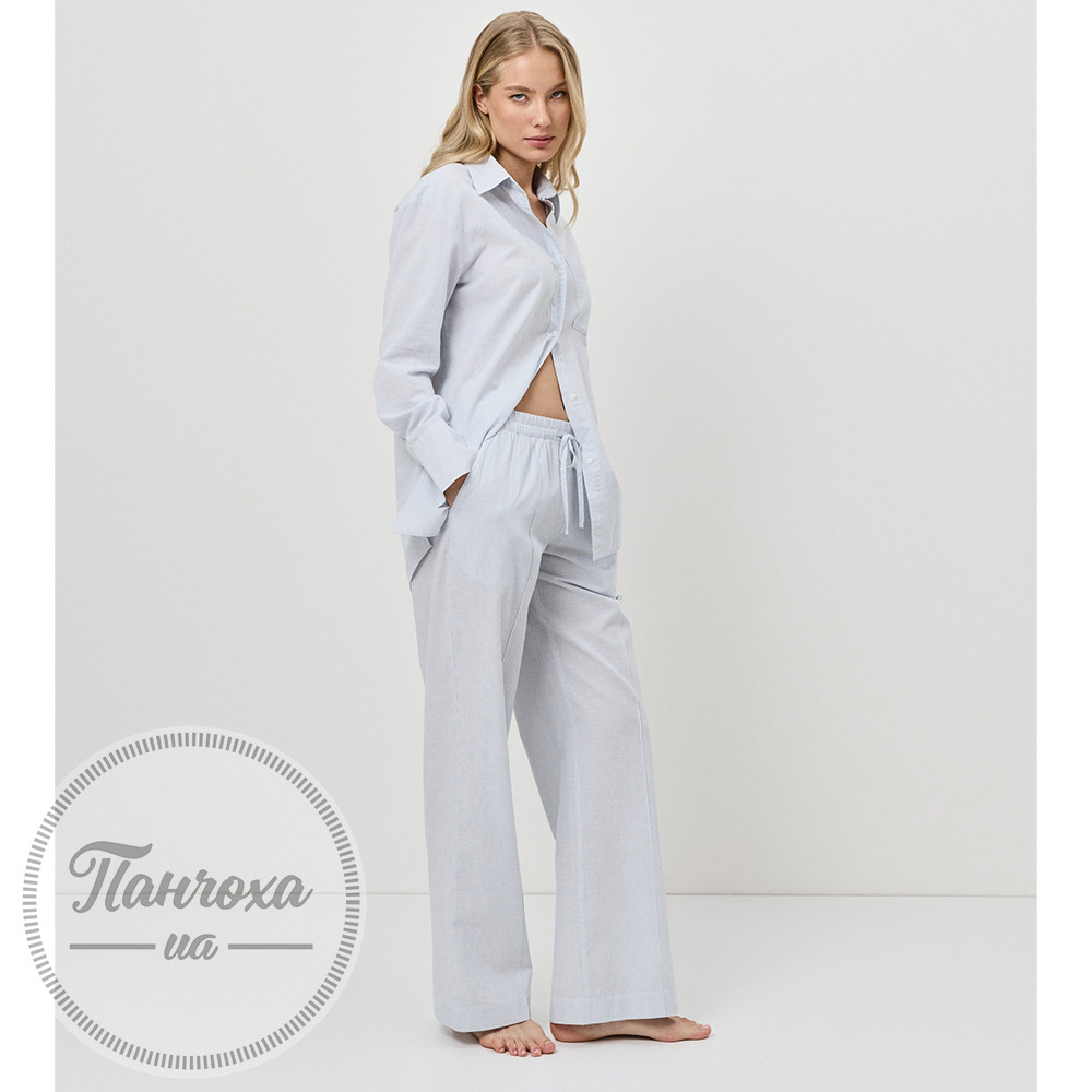 Легкий та класичний, цей світло-блакитний смугастий курортний комплект пропонує комфорт із приталеним кроєм. Комплект включає сорочку з довгими рукавами на ґудзиках та довгі штани. Виготовлено з дихаючої тканої суміші бавовни та льону, що забезпечує м'яке та повітряне відчуття.