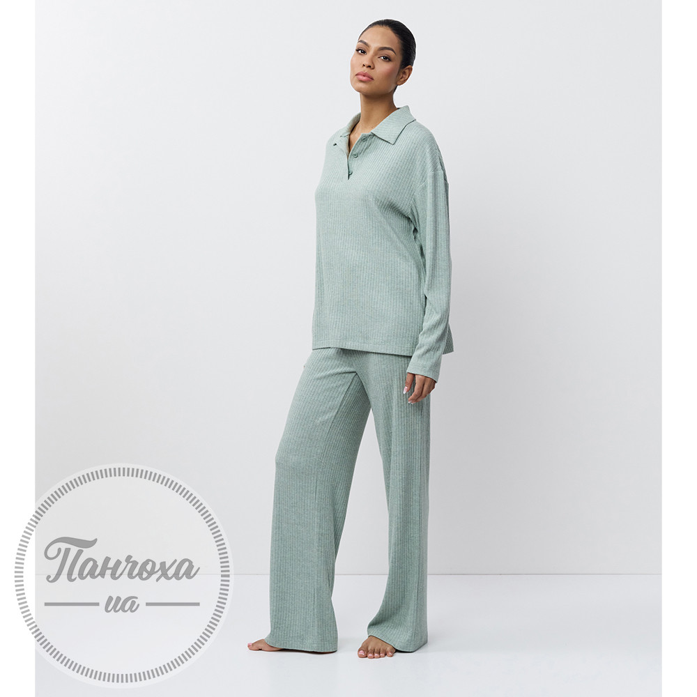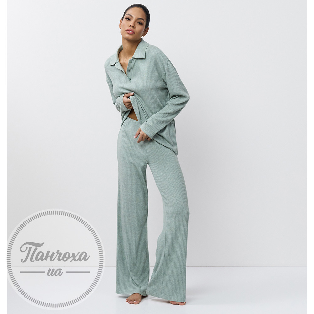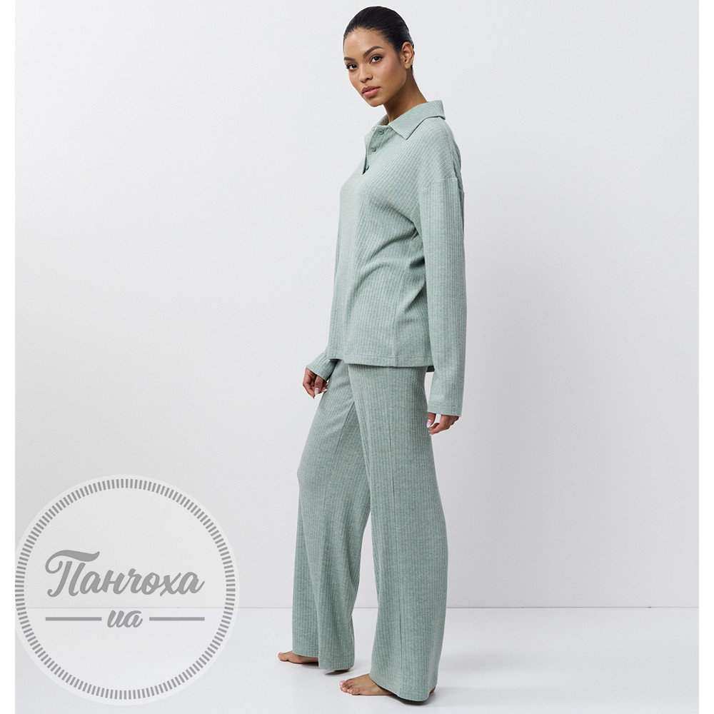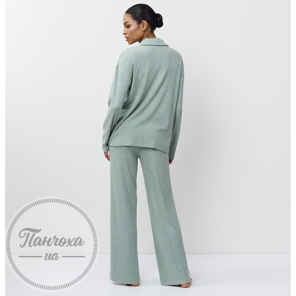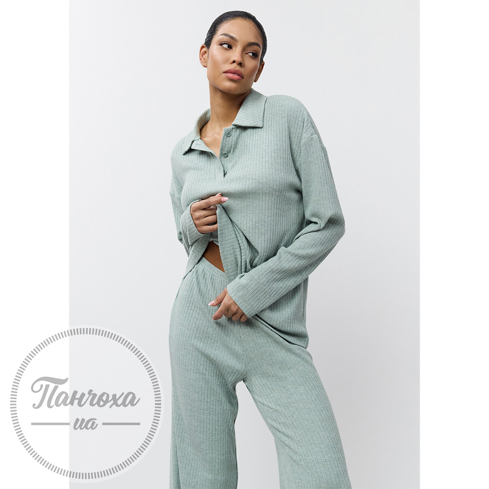 Елегантний комплект одягу для дому,виготовлений з ребристої віскозно-поліестерової тканини, яка забезпечує м'якість та вишуканий вигляд. Колір - приглушений шавлійно-зелений. Верх має вільний крій з класичним коміром та тонкою застібкою на ґудзиках для шикарного вигляду.