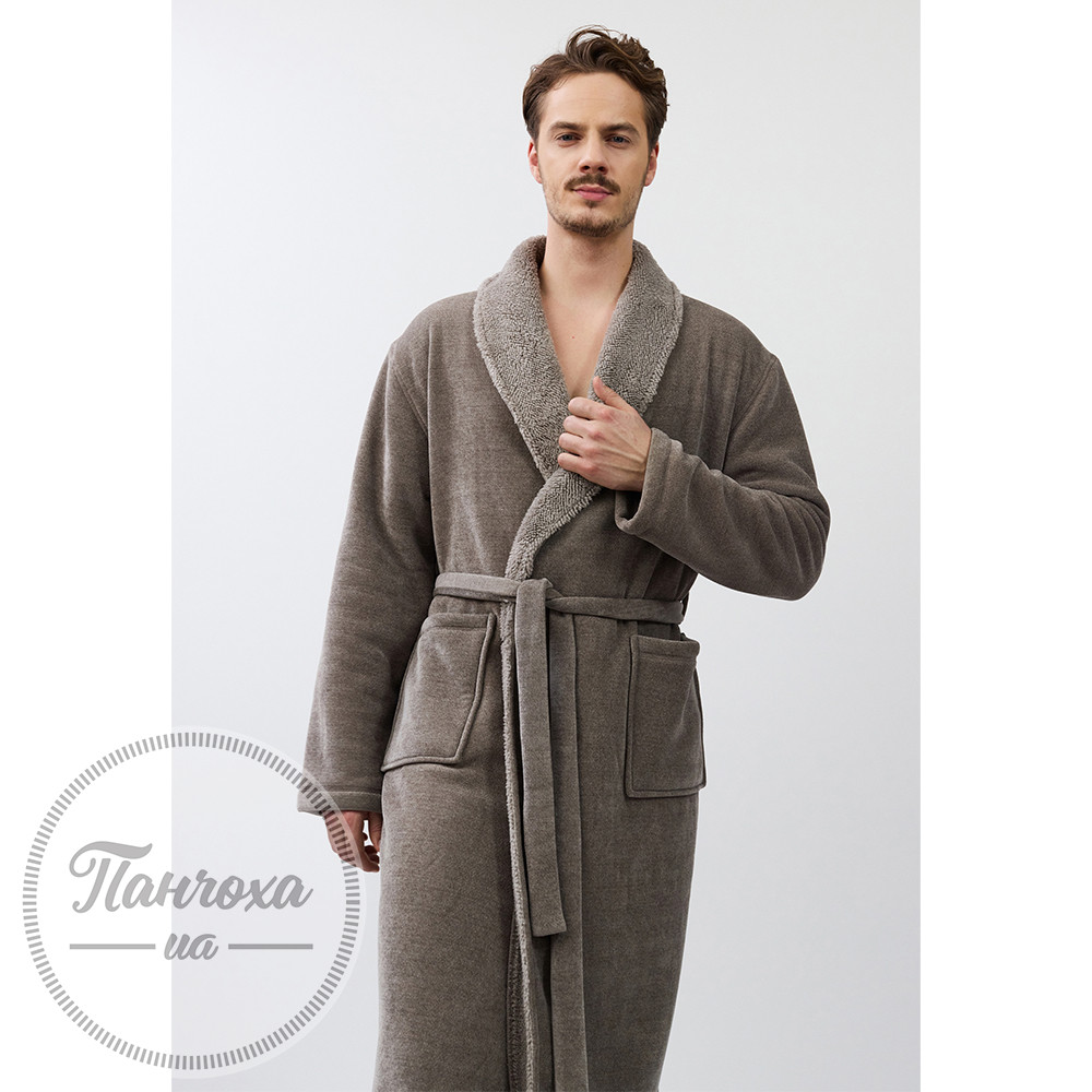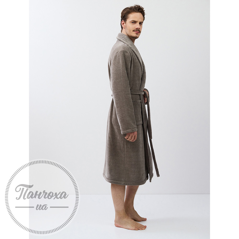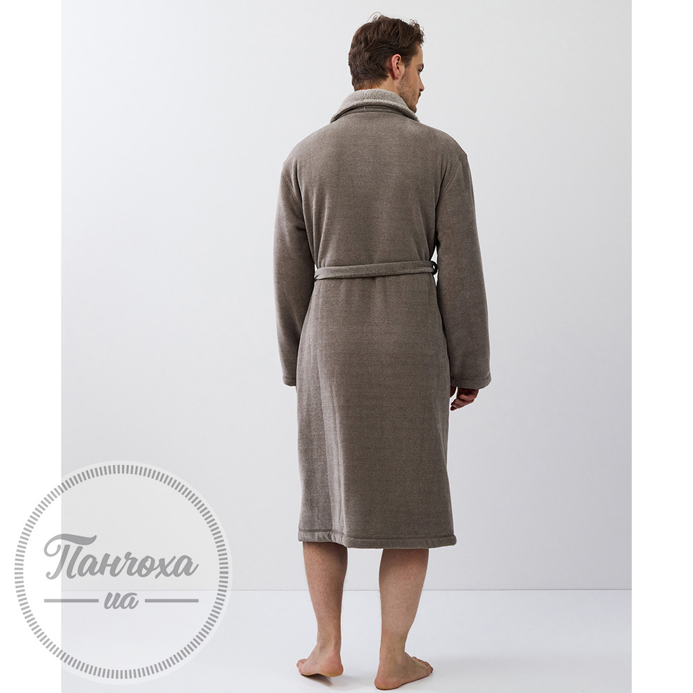 Класичний і затишний халат із унікальною текстуроюВиготовлений зі спеціальної двосторонньої поліестерної тканини: м’який і пухнастий усередині для тепла та комфорту, із фактурним в’язаним ефектом зовні для вишуканого вигляду.Колір — taupe brown (приглушений коричнево-сірий).Класичний шалевий комір.Рукави повної довжини зі структурованими манжетами.