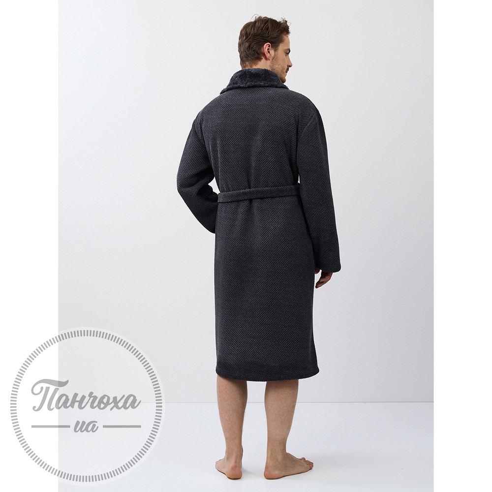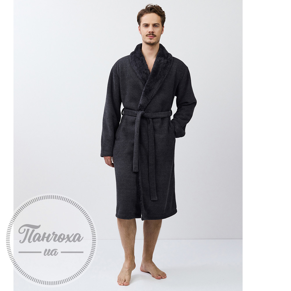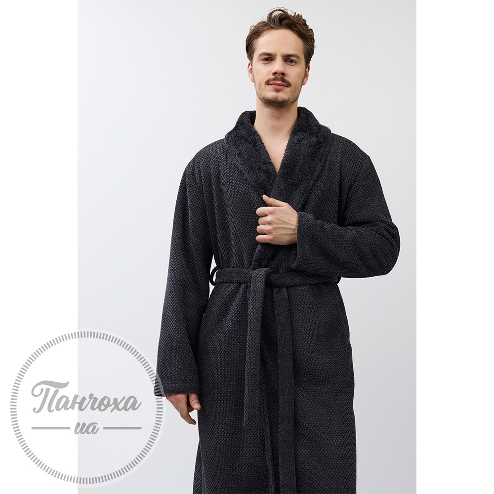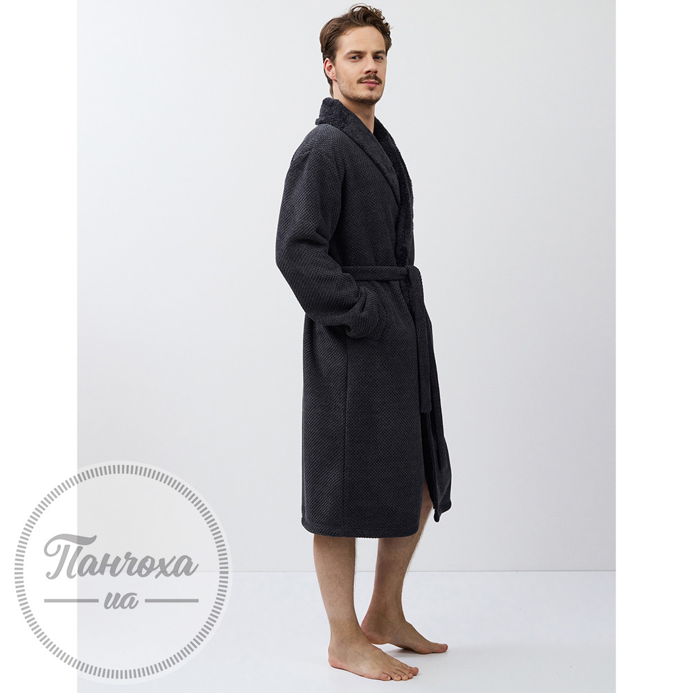 Виготовлений із розкішної двосторонньої поліестерової тканини — м’який і пухнастий зсередини, з фактурою вафельної поверхні зовні.Колір — глибокий антрацитовий сірий.М’який шалевий комір додає тепла й комфорту.Довгі рукави.