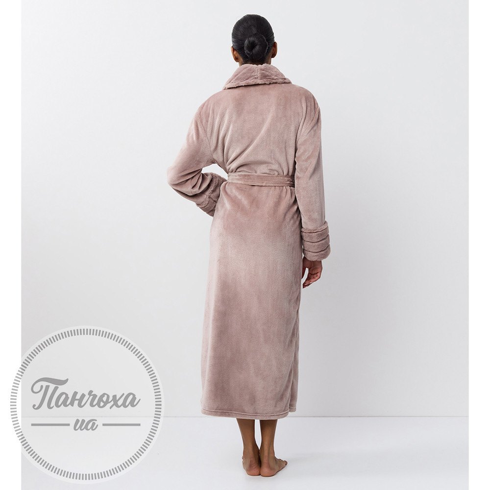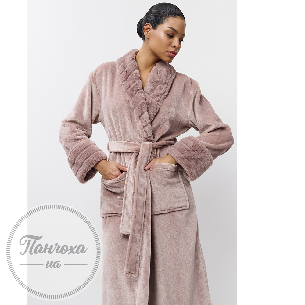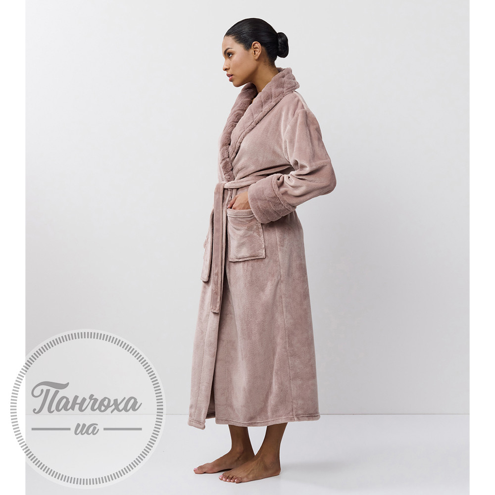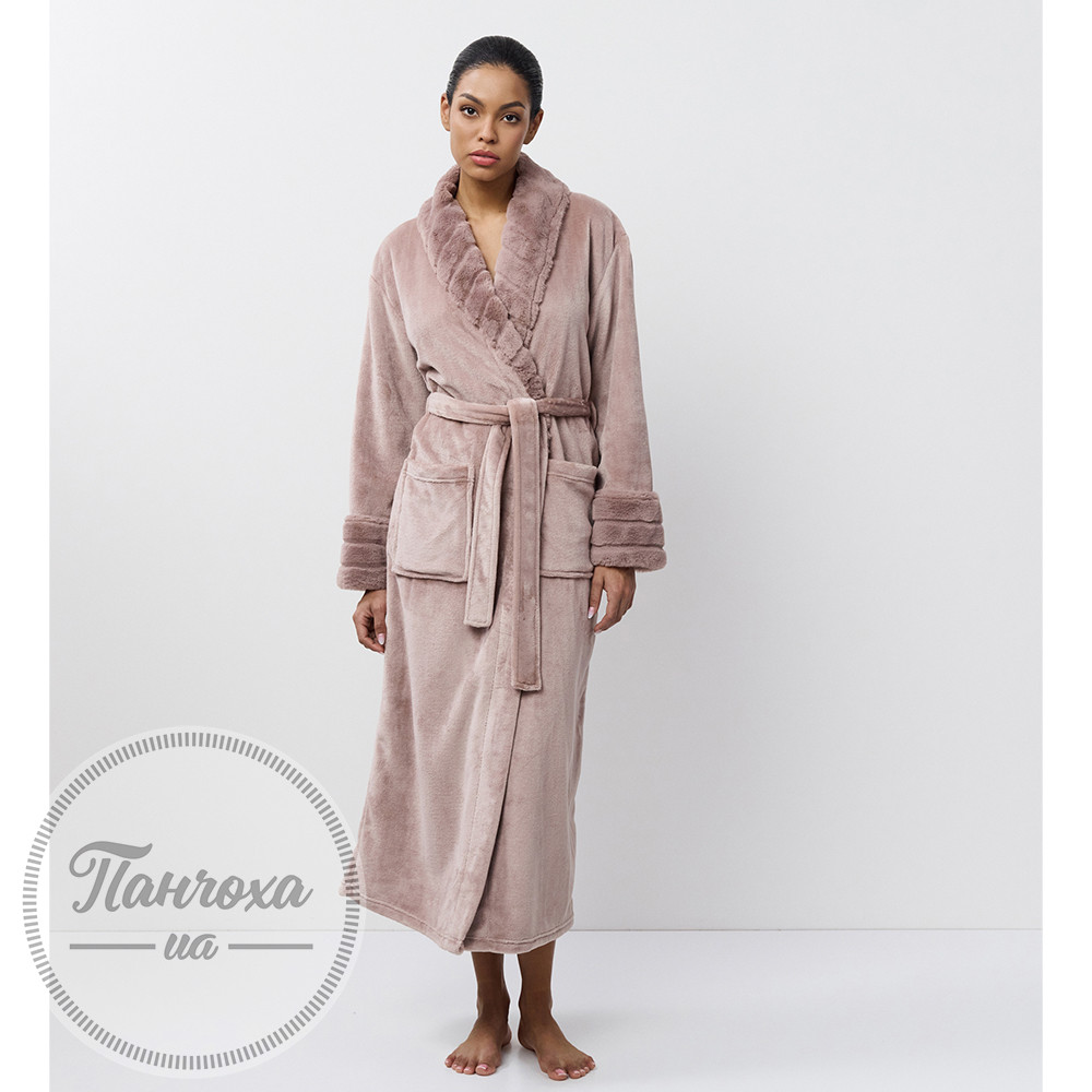 Довгий халат з пишними деталями на комірі та манжетах.Виготовлений з м'якої поліестерової тканини.Колір - бузково-рожевий.Має довгі рукави з пишними манжетами.Кишені квадратної форми для довершеного образу.