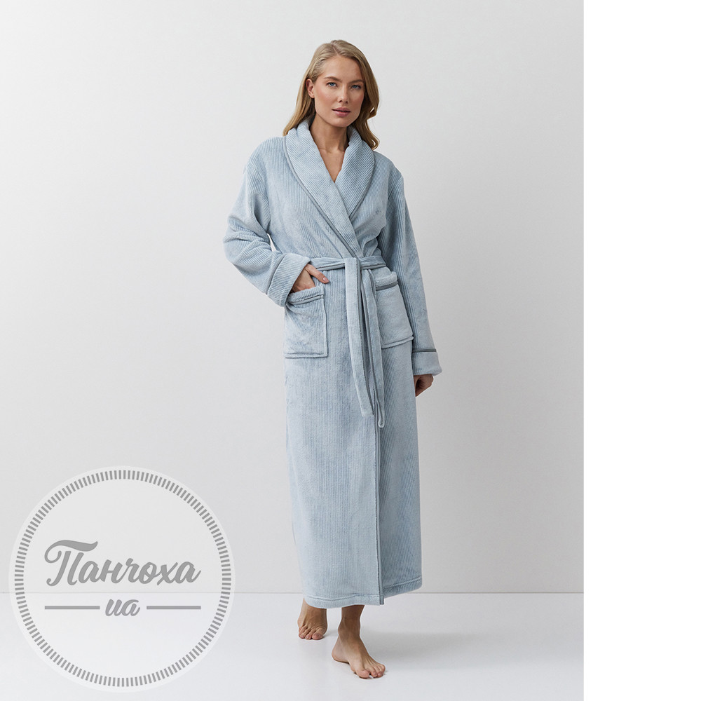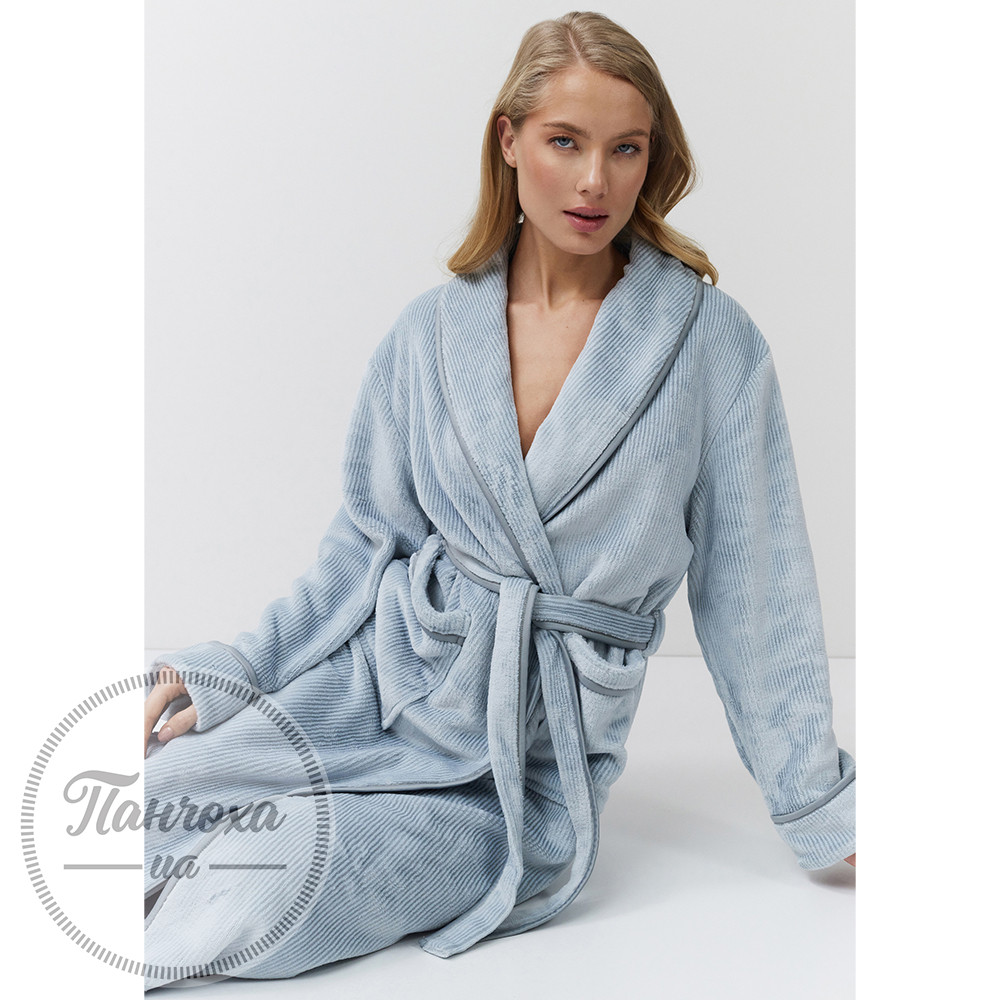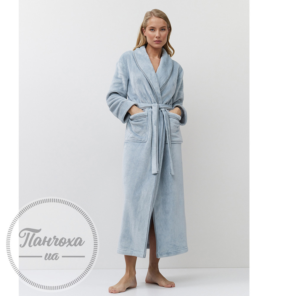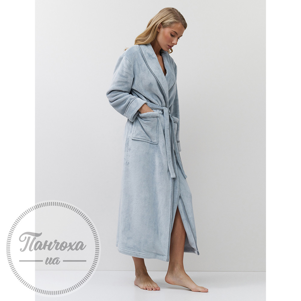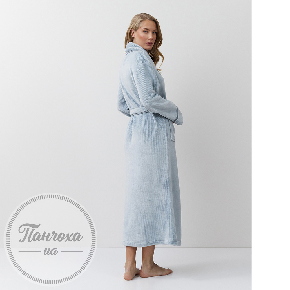 Довгий халат з м'якою смугастою текстурою. Виготовлений з плюшевої поліестерової тканини з тонким візерунком у смужку. Колір - блакитний.