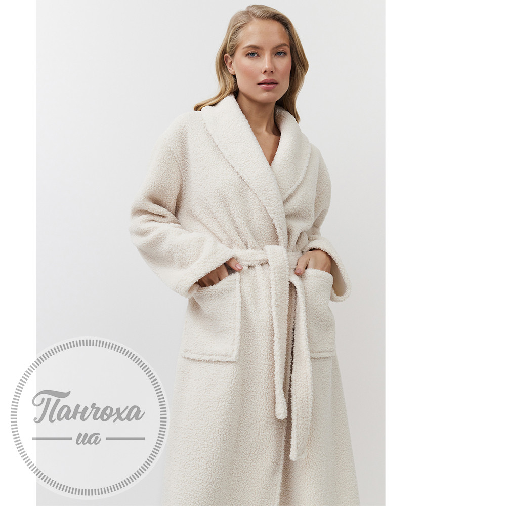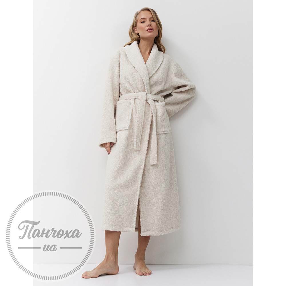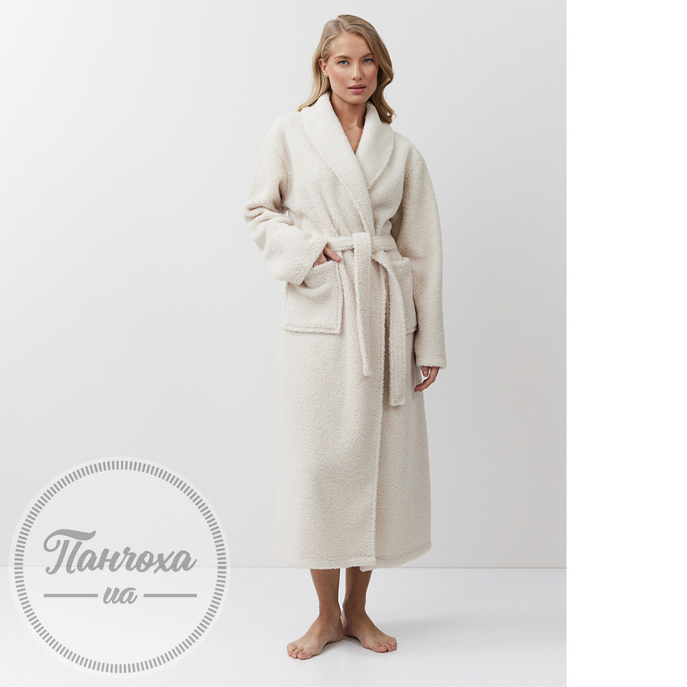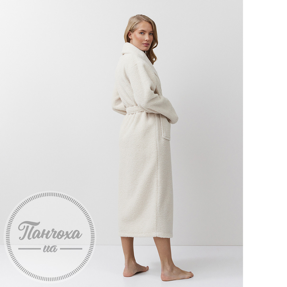 Довгий халат з розкішної двосторонньої тканини. Колір - теплий кремово-бежевий. Виготовлений зі спеціальної та щільної двосторонньої поліестерової тканини. Внутрішня частина - гладка та м'яка для додаткового комфорту. Зовнішня частина - плюшева текстура з ефектом ведмедика для затишку. Має рукави повної довжині зі структурованими манжетами.