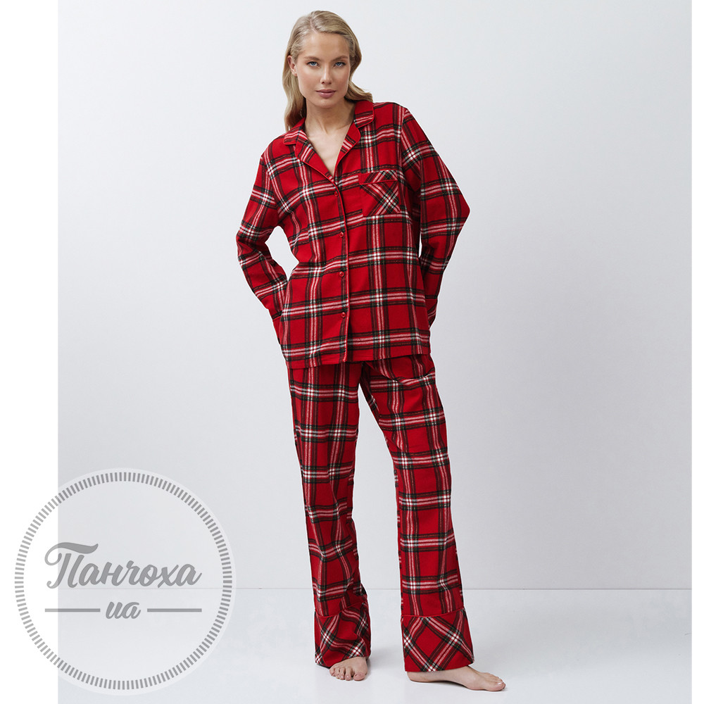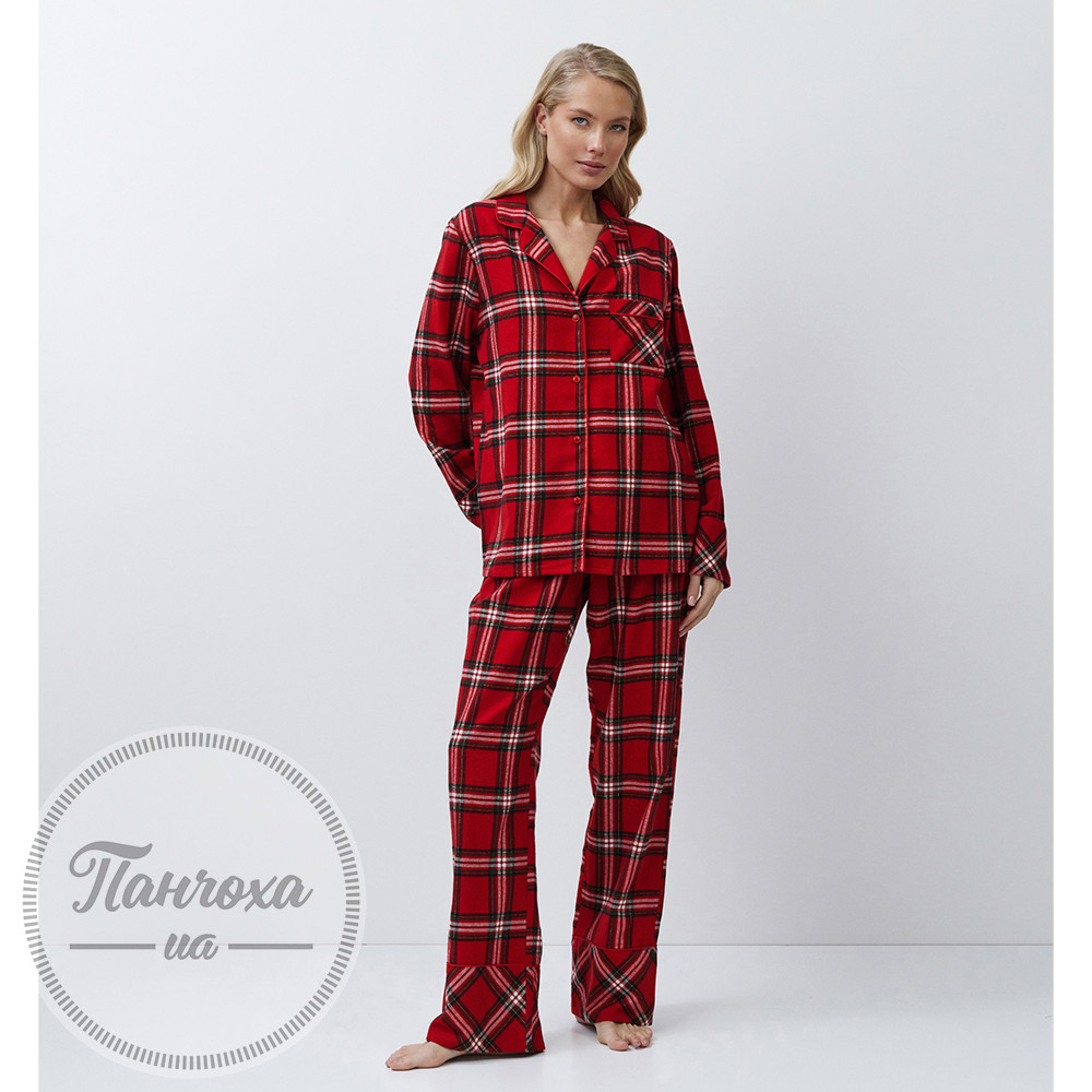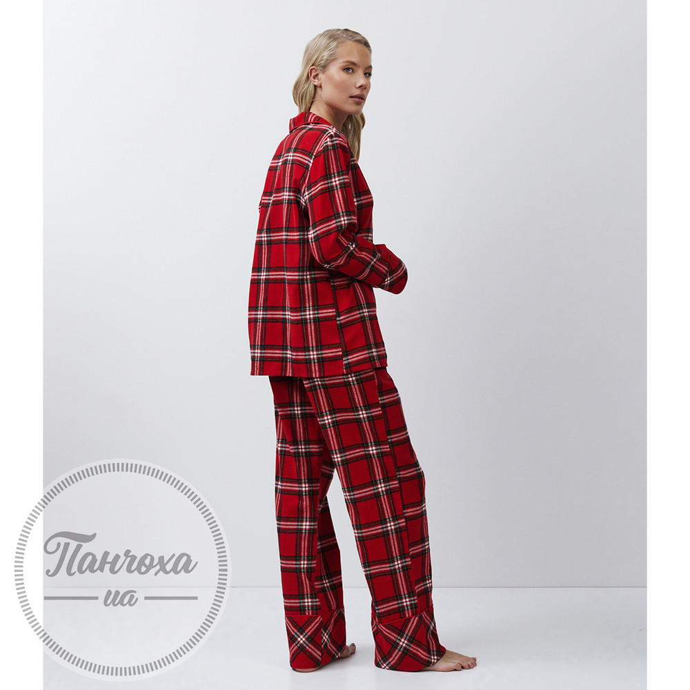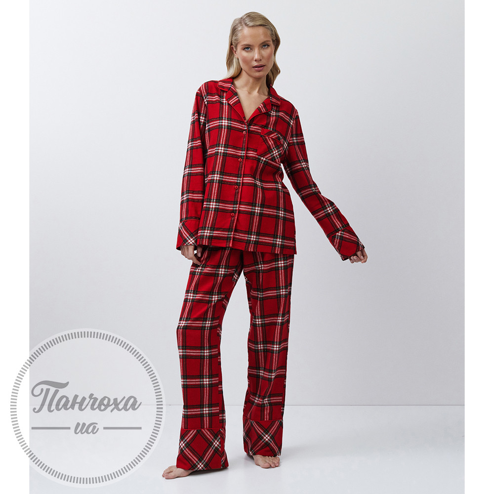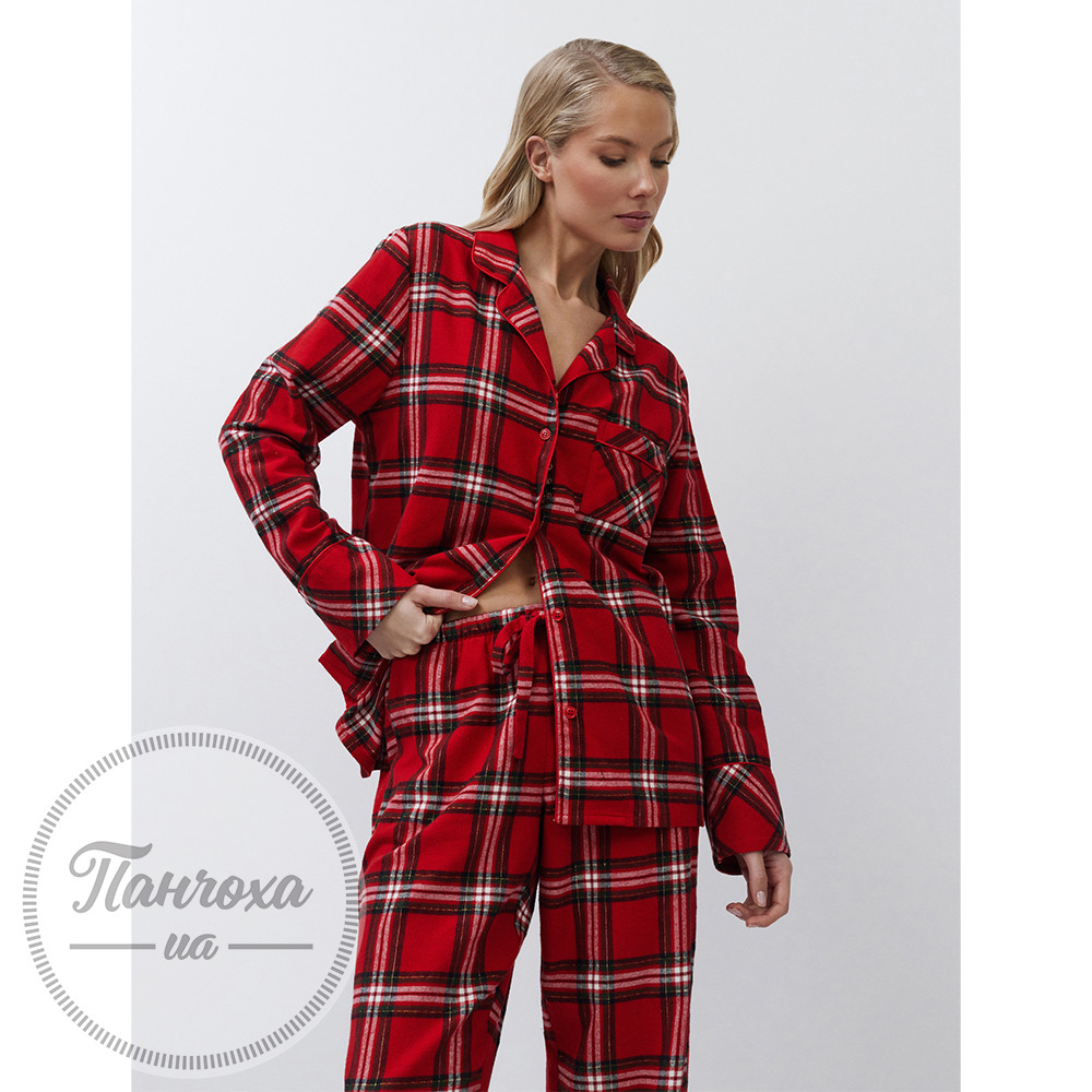 Святковий піжамний комплект у червону клітинку. Верх у сорочковому стилі з довгими рукавами. Окантування по коміру, нагрудній кишені, манжетах і низу штанів. Вишивка "Ho Ho Ho" між ґудзиками, поруч із нагрудною кишенею.