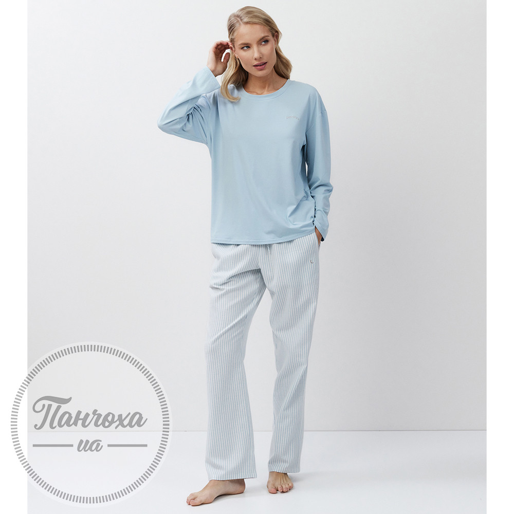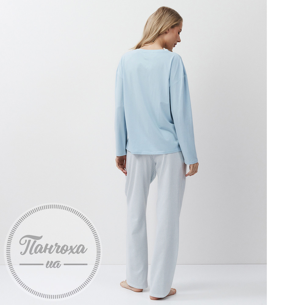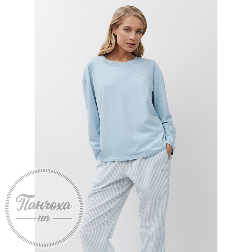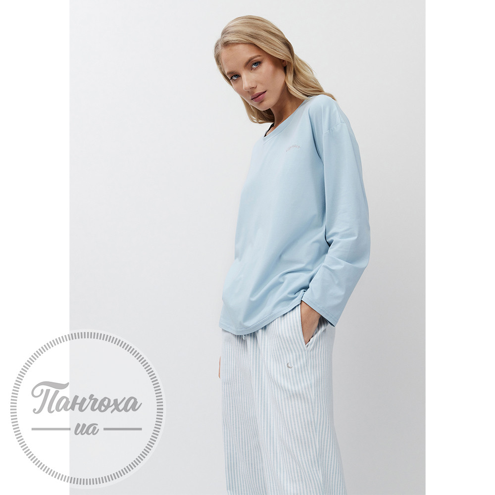 Представляємо піжамний комплект, до складу якого входить футболка з довгим рукавом з округлим комірцем, м’яким ефектом спущеної лінії плеча. На правому боці — вишивка «Midnight». Штани повної довжини в синьо-білу смужку з бічними кишенями та вишивкою місяця під правою кишенею.Тонкий пояс із регульованими зав’язками. Модель має зріст 175 см і носить розмір S.