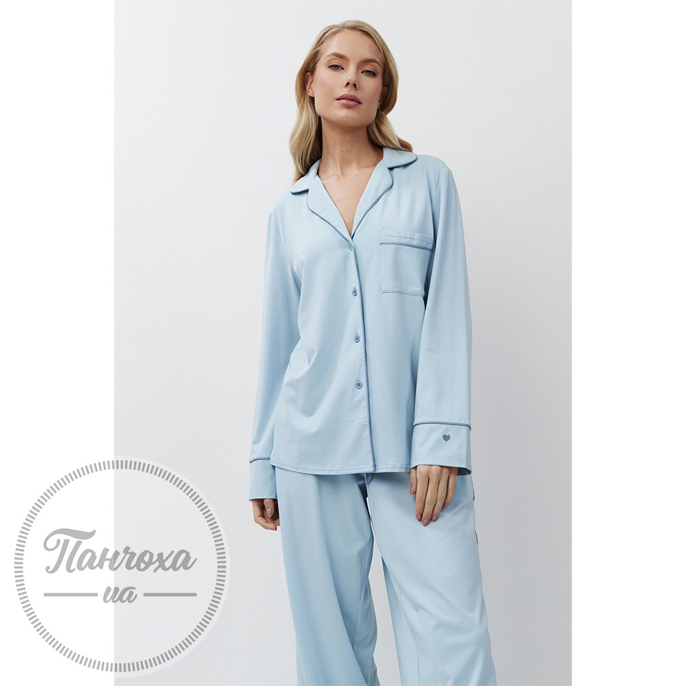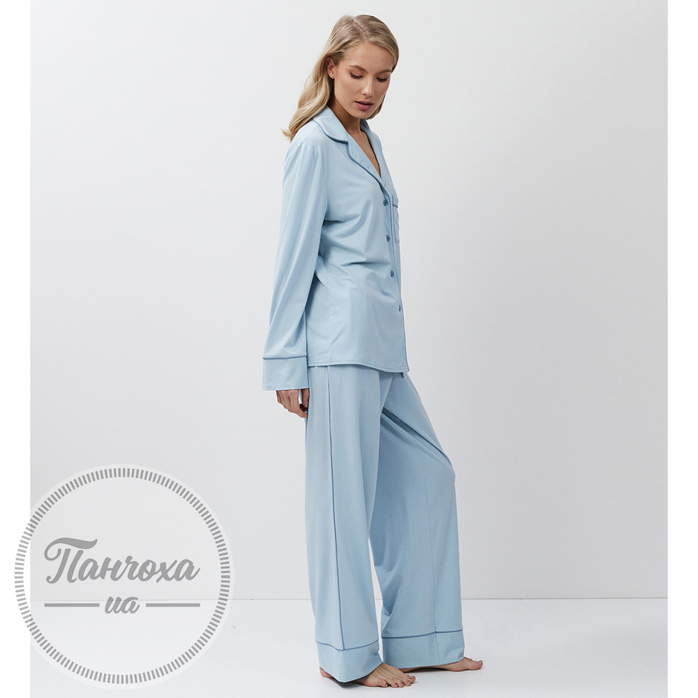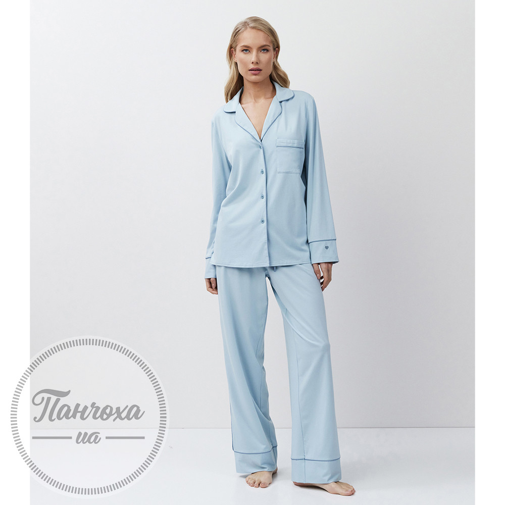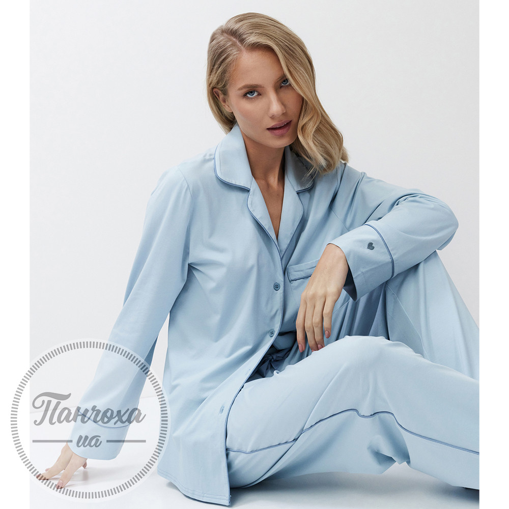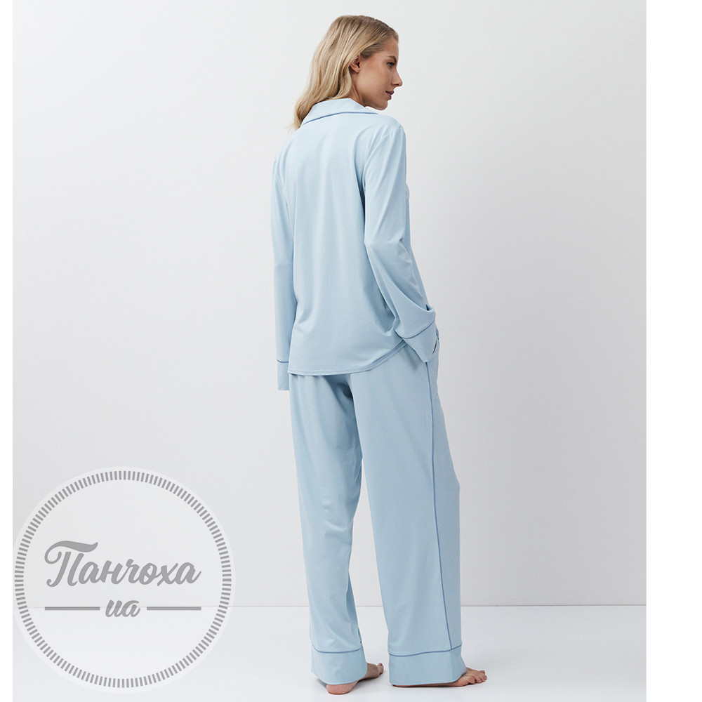 Елегантний та вишуканий піжамний комплект, розроблений для максимального комфорту. Виготовлений з м'якої та дихаючої тканини з модалу, що забезпечує гладкість та легкість. Колір - безтурботний небесно-блакитний. Верх сорочки має класичний комір з вирізом, нагрудну кишеню та вільний силует. Витончені деталі канта підкреслюють виріз горловини, кишені, манжети, боки та низ штанів. Штани прямого крою забезпечують комфортну, але вишукану посадку.