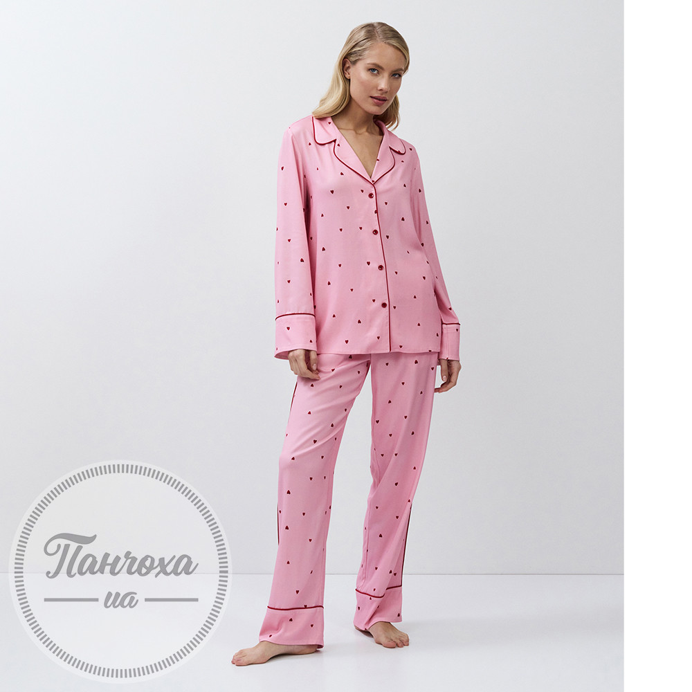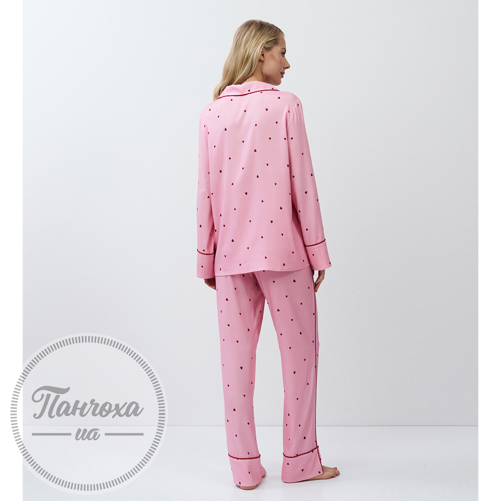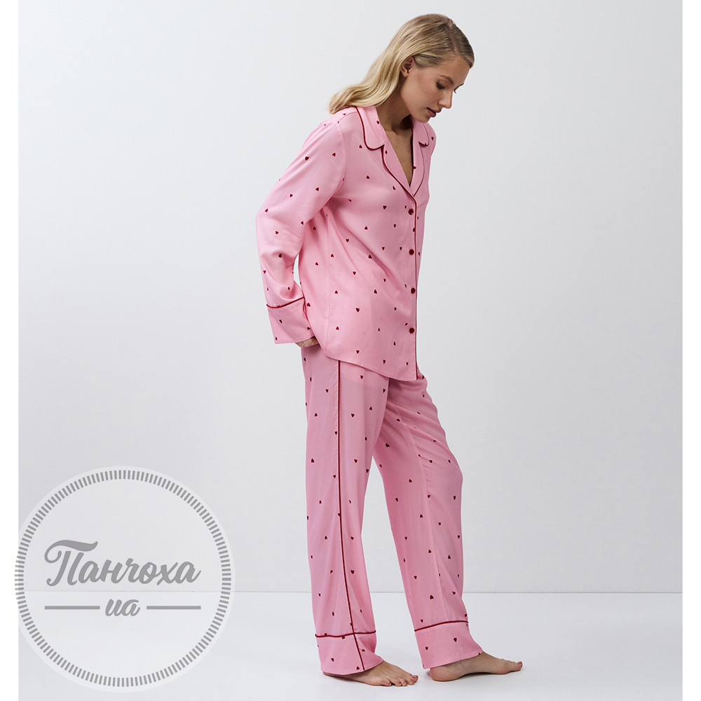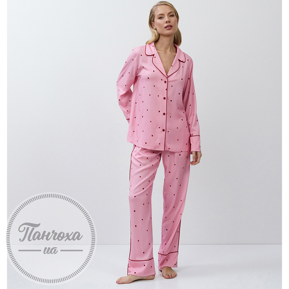 Піжама з рожевим принтом у сердечка та контрастним бордовим кантом.