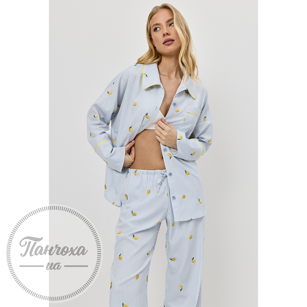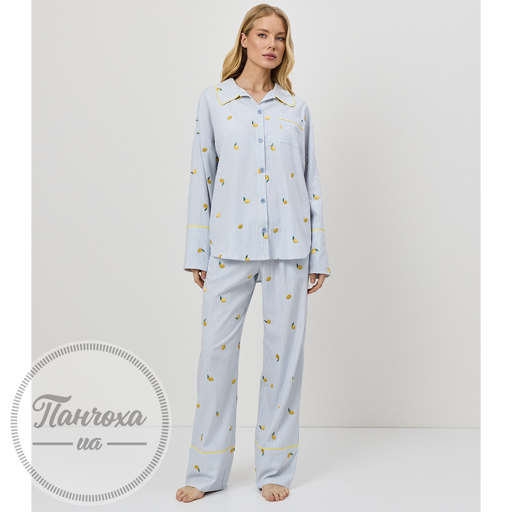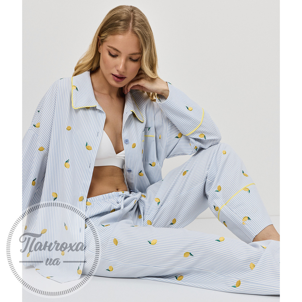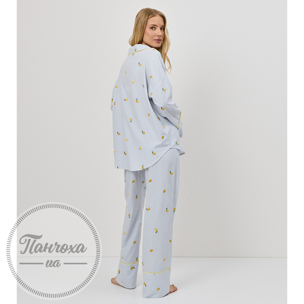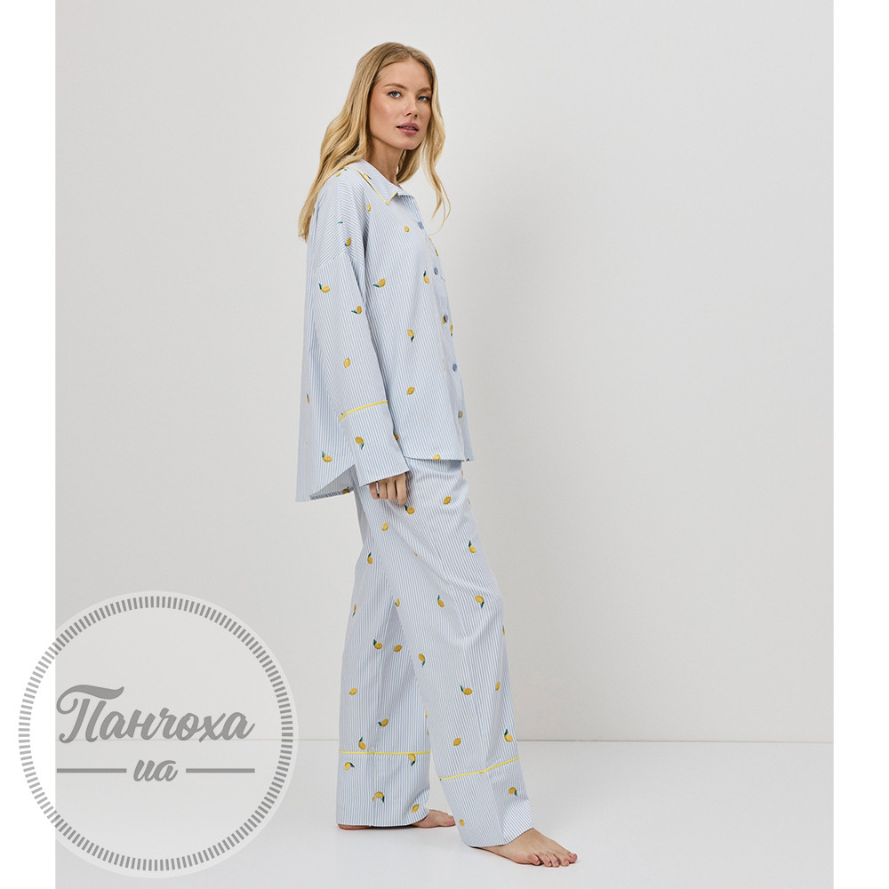 Чарівний та свіжий, цей піжамний комплект виготовлений для грайливого, але водночас вишуканого відчуття.Виготовлений з м’якої тканини – дихаючої, легкої та ідеальної для відпочинку цілий рік.Верх має вільний крій з класичною застібкою на ґудзиках, нагрудною кишенею та закругленим коміром, оздобленим контрастною окантовкою.Штани повної довжини мають бічні кишені та нижній поділ, оздоблений жовтою окантовкою в тон. Зріст моделі – 175 см, розмір S.