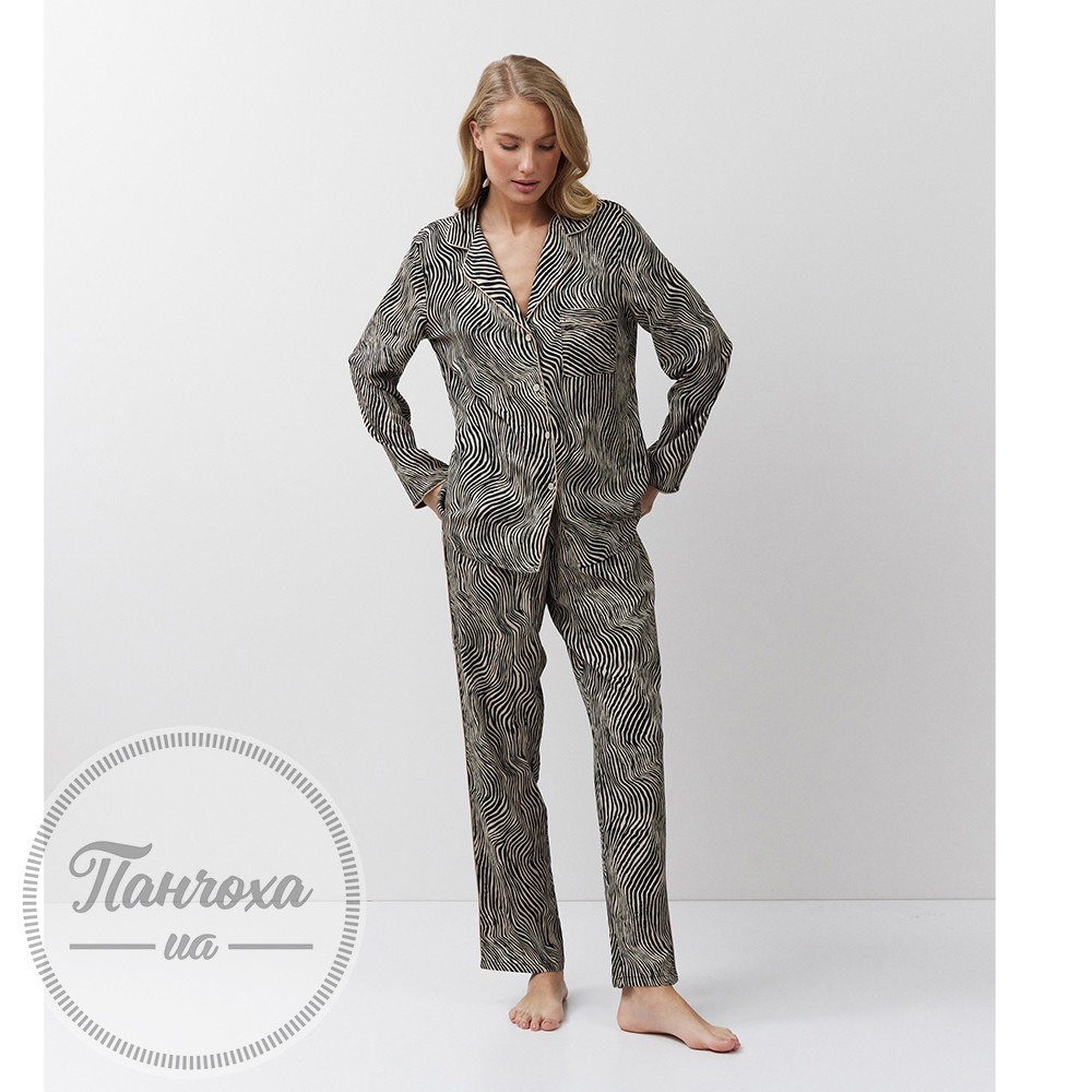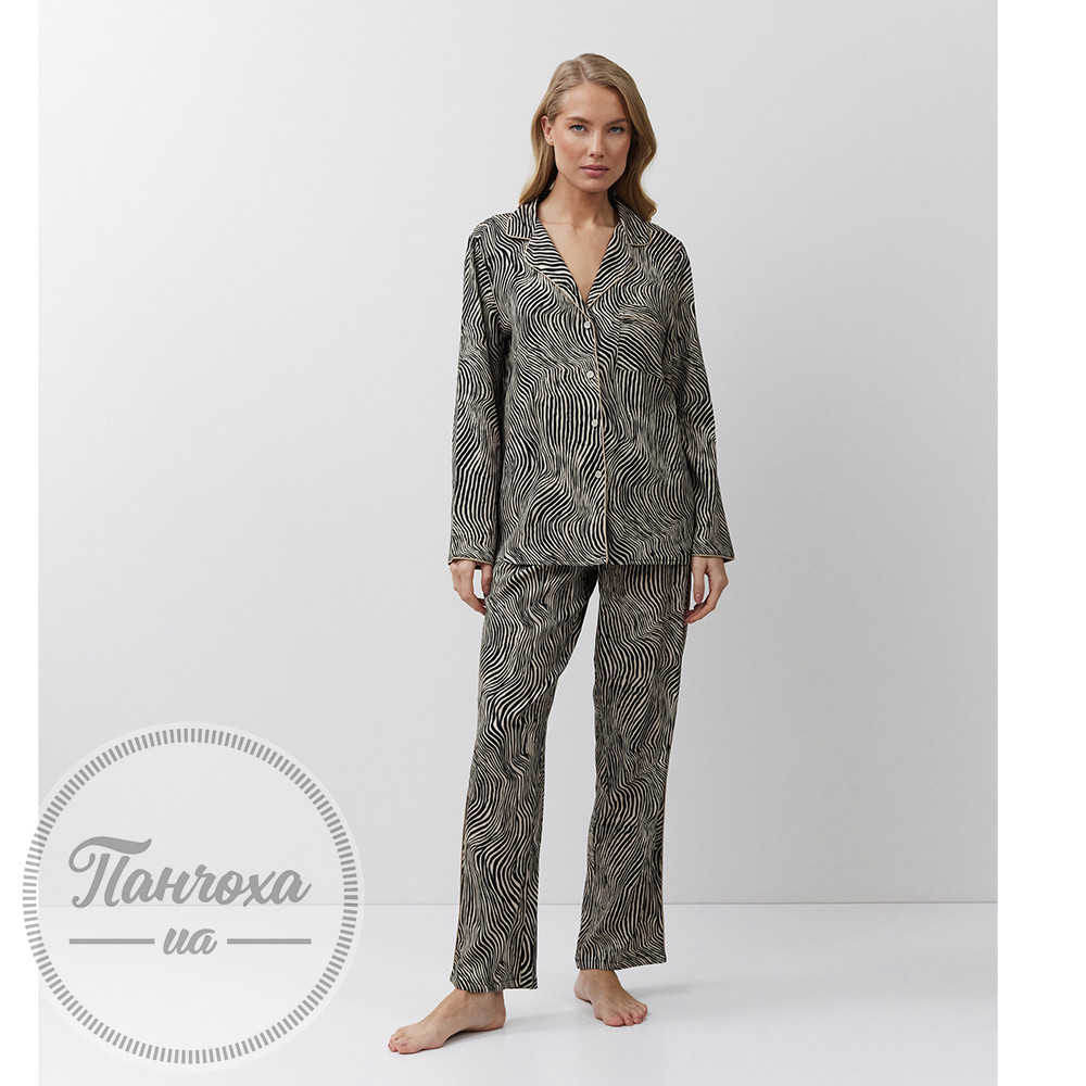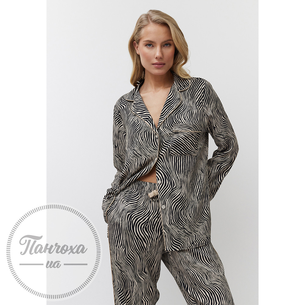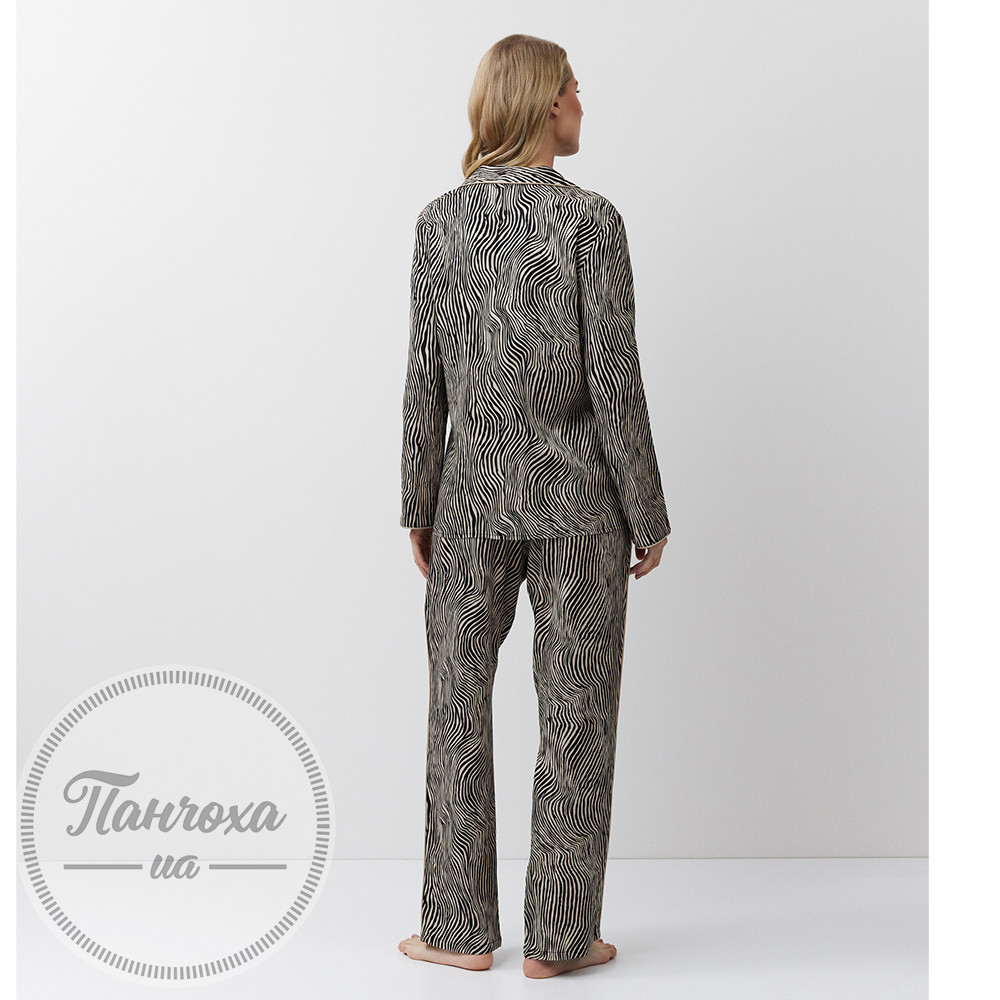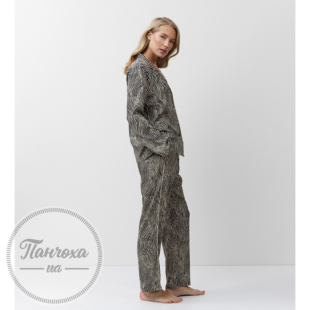 Елегантний, але сміливий піжамний комплект із безшовним візерунком і штанами. Виготовлений з еластичної віскозної тканини. Верх у сорочковому стилі, прямого крою, з довгими рукавами. Бежеві ґудзики. Бежеве окантування навколо горловини, нагрудної кишені та країв манжетів. Окантування також проходить уздовж боків штанів. Штани прямого крою з боковими кишенями та регульованим бантом на поясі. Зріст моделі 175 см, розмір S.