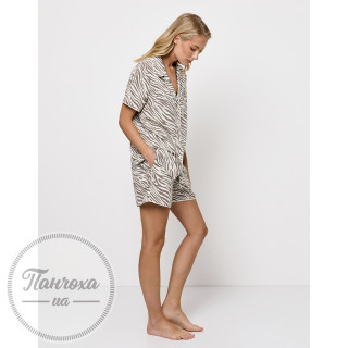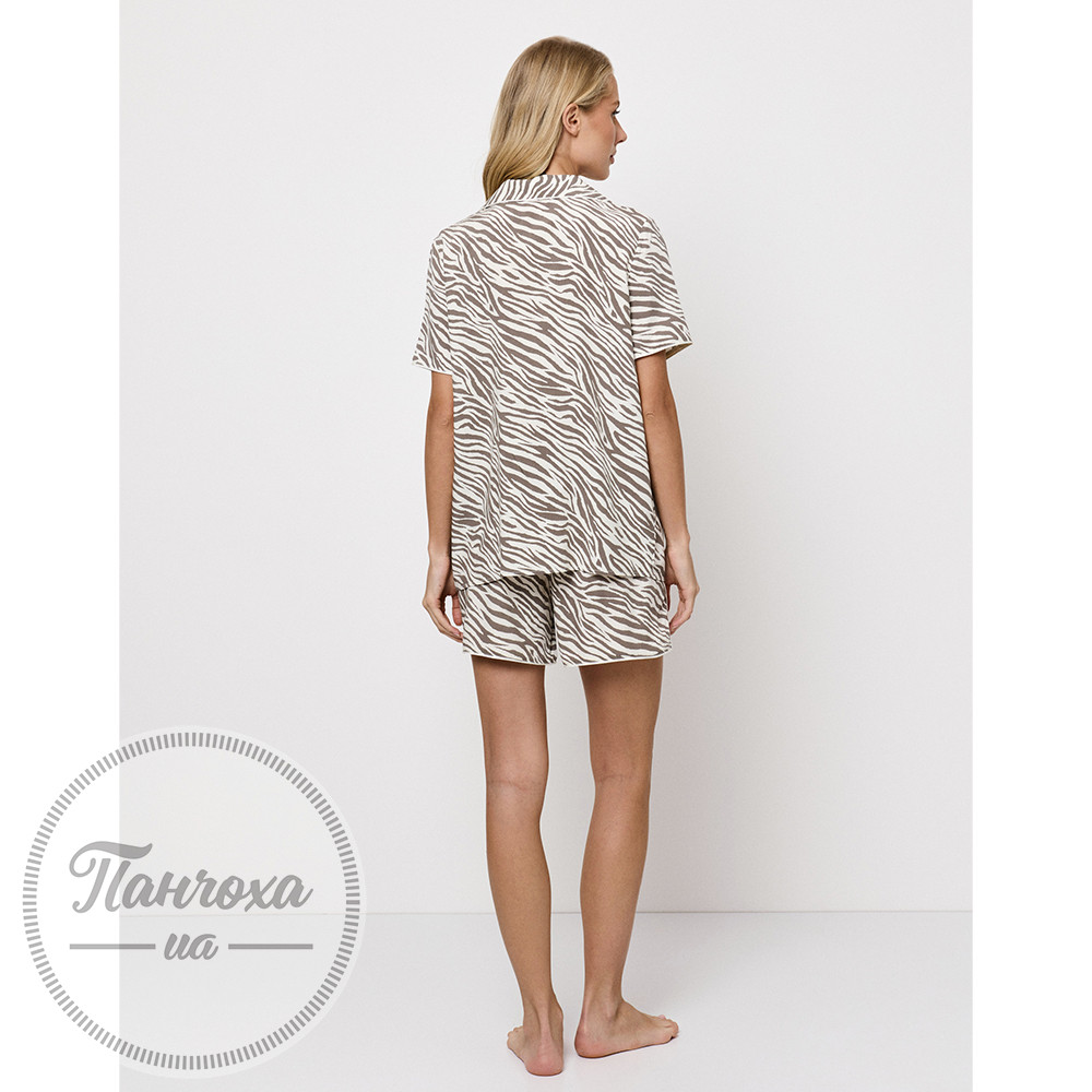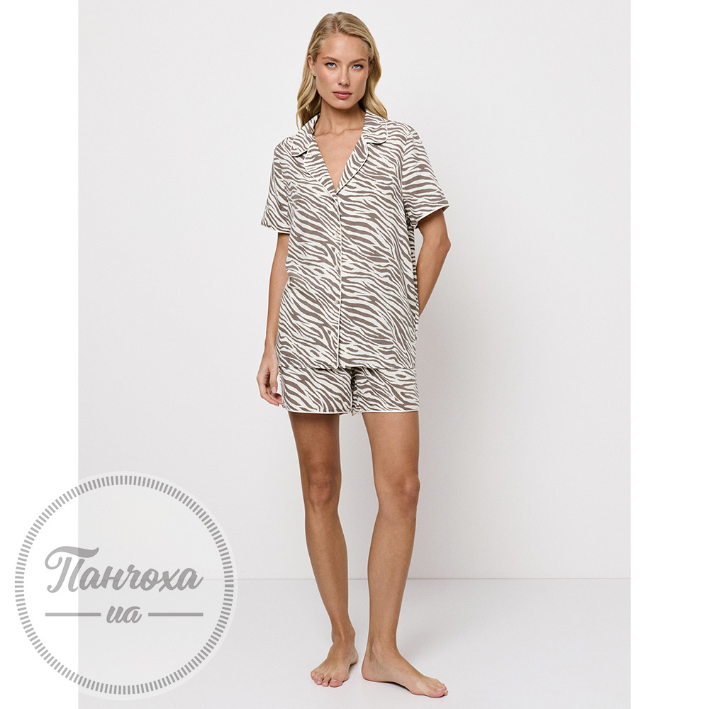Виготовлена з блискучої віскози з кремово-коричневим зебровим принтом. Сорочка з короткими рукавами, округлим V-вирізом і кремовою окантовкою.