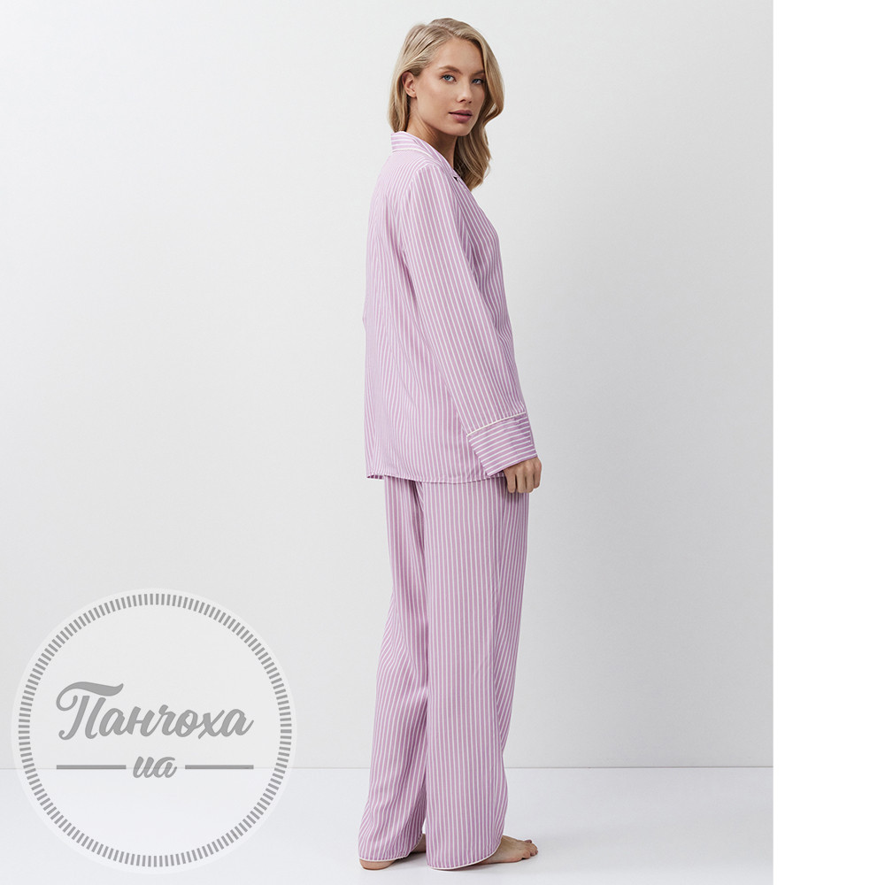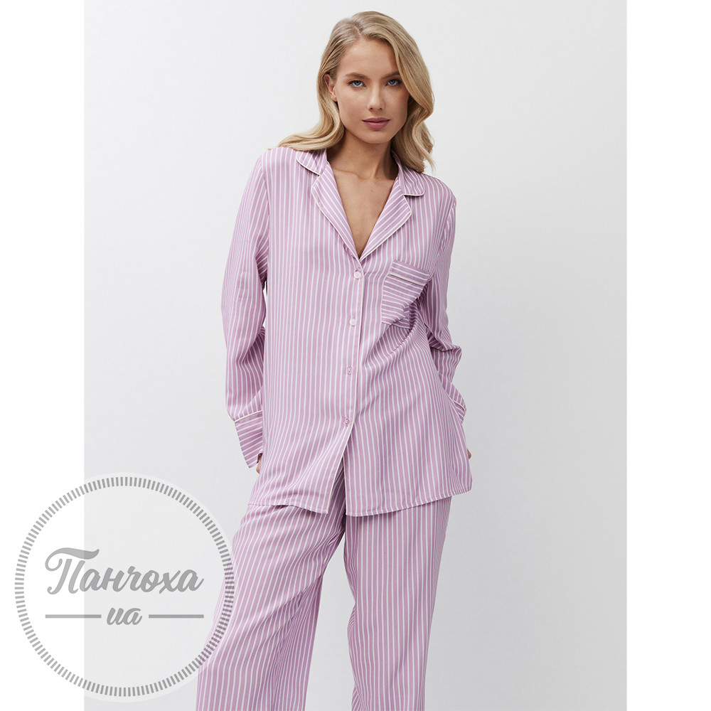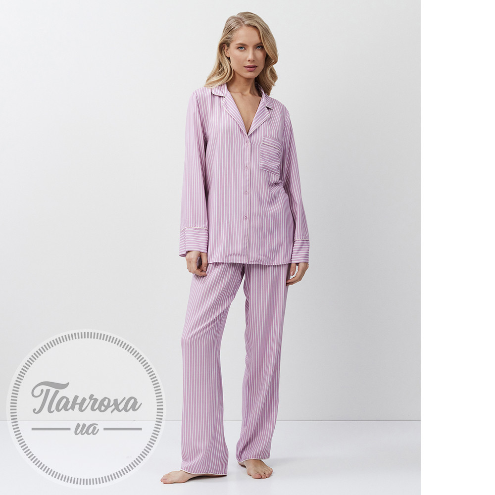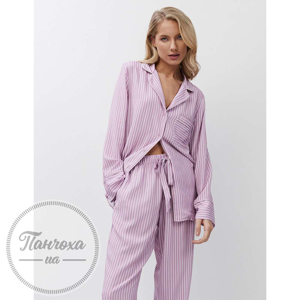 Піжамний комплект класичного крою зі штанами,виготовлений із м’якої віскозної тканини.Безшовний візерунок у смужку.