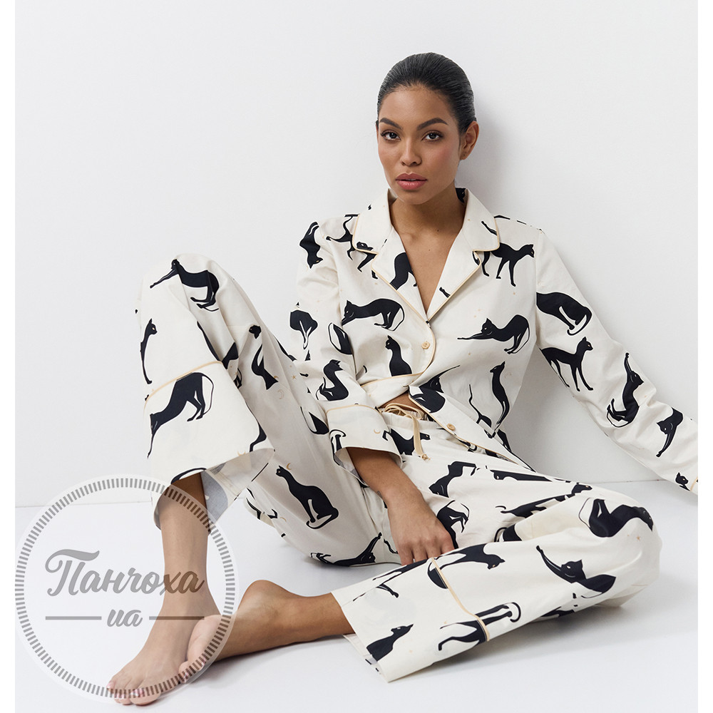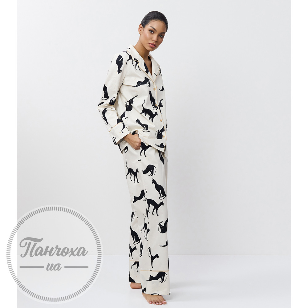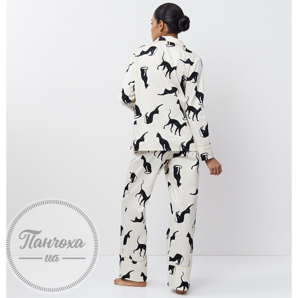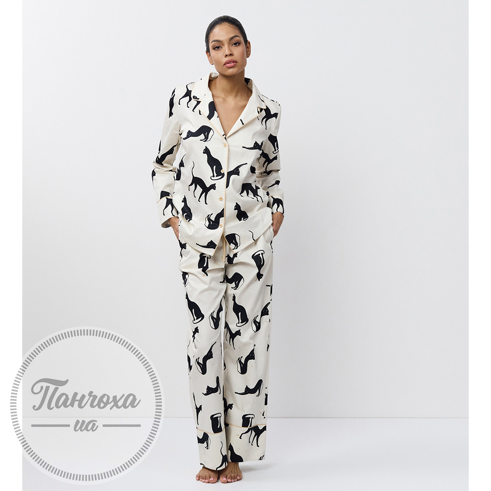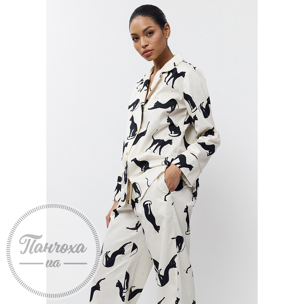 Виготовлений із блискучої бавовняної поплінової тканини з грайливим принтом котиків.Верх у класичному сорочковому стилі з оздобленням золотистим кантом навколо горловини та на манжетах.