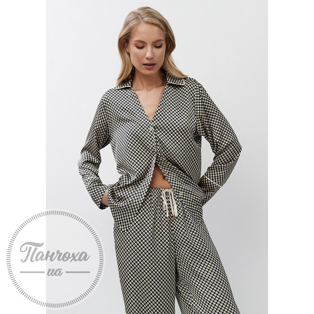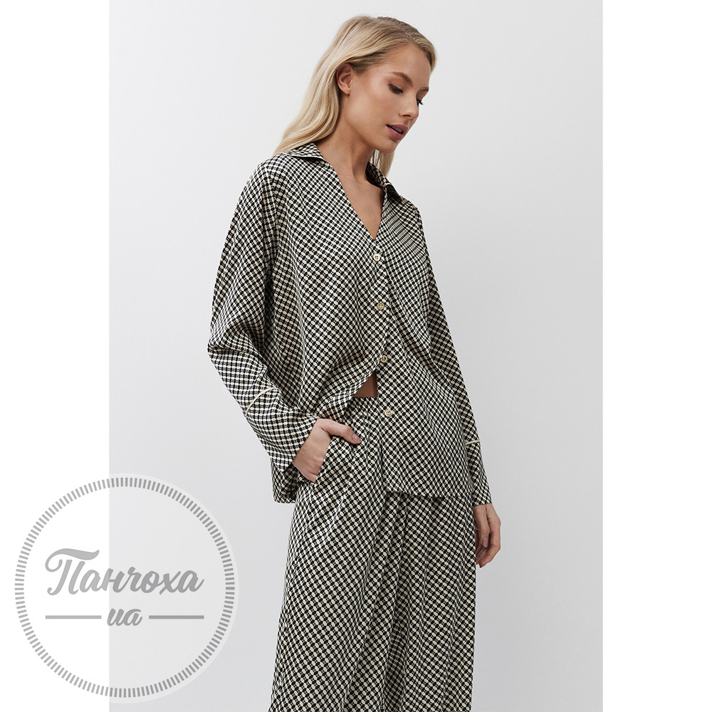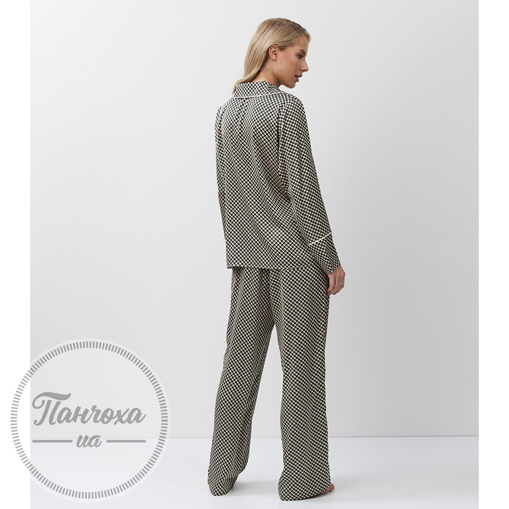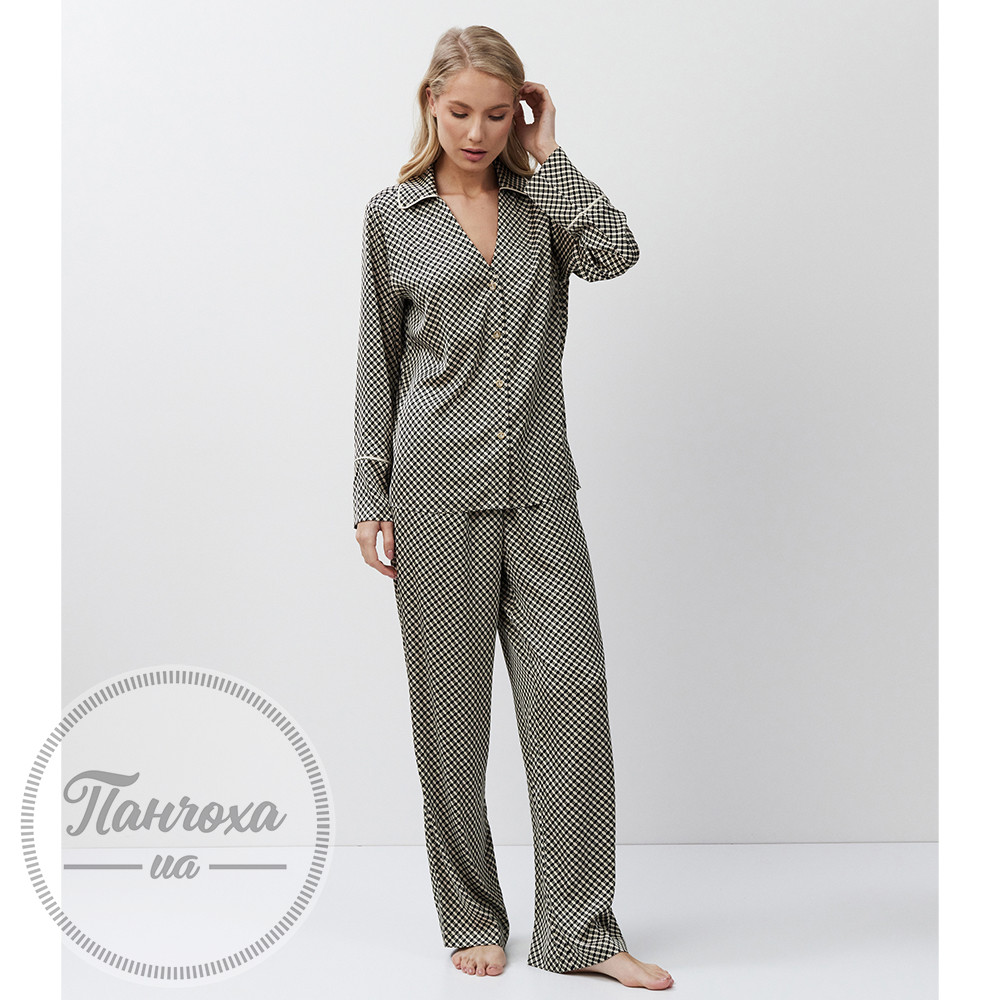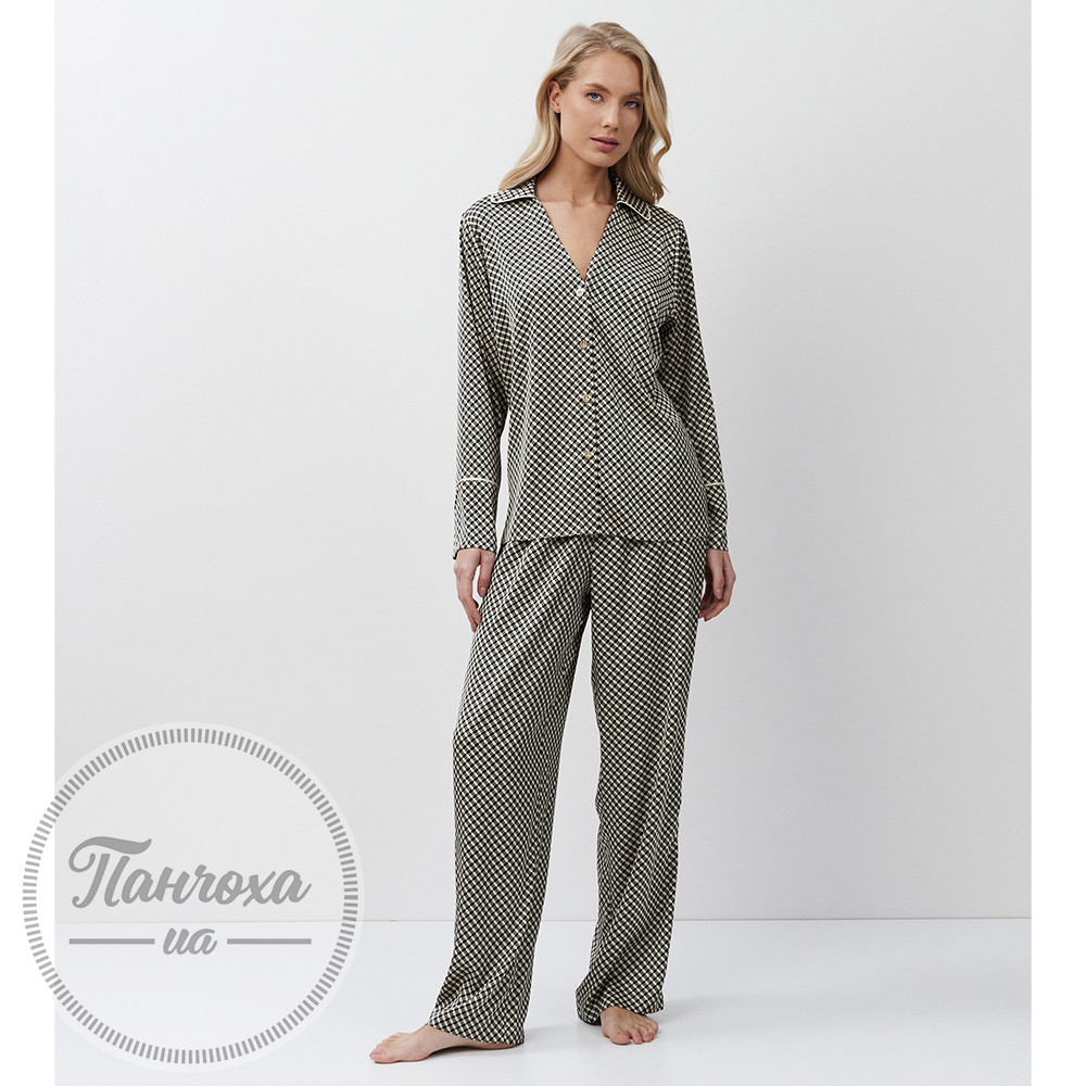 Розкішний атласний піжамний комплект зі штанами з безшовним геометричним візерунком. Класичний верх у стилі сорочки з окантовкою навколо коміра та манжетів. Високі манжети. Візерунок поєднує бежевий, чорний та шавлієвий кольори. Золотисті ґудзики. Мінімалістичний регульований бант на талії.