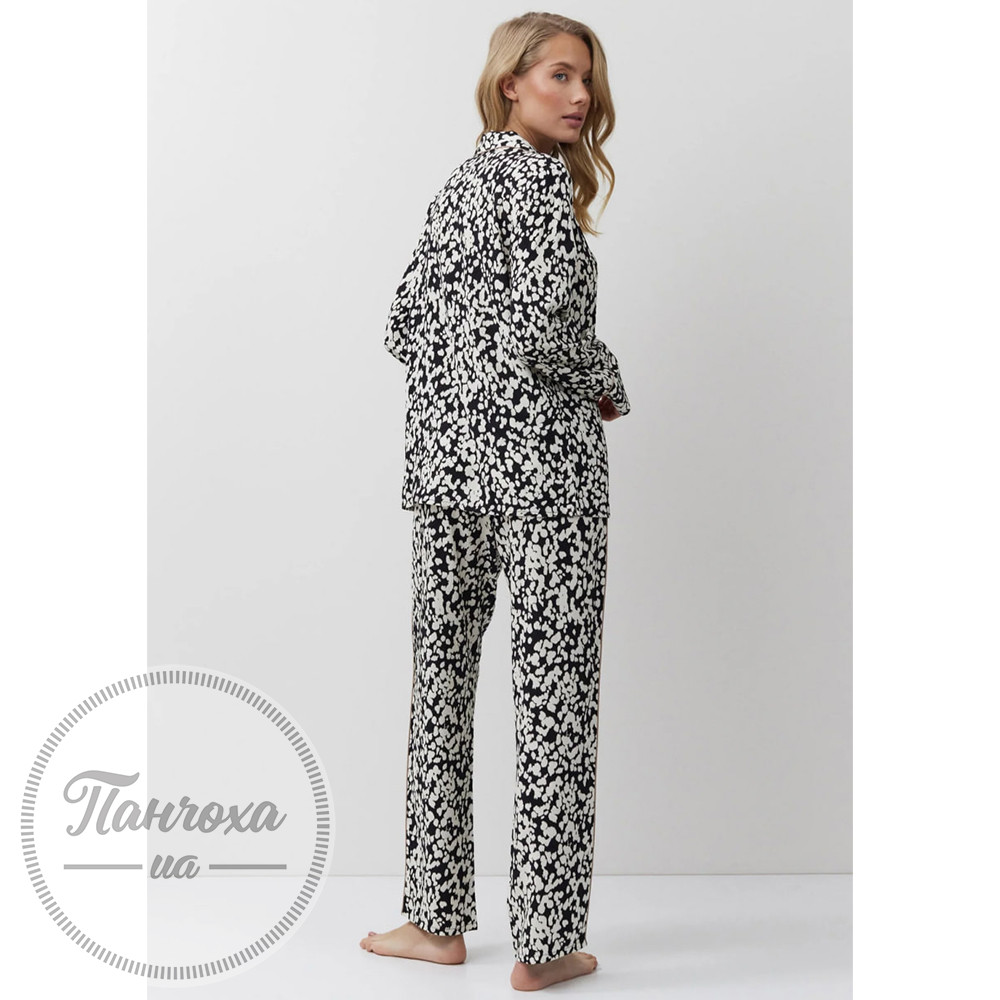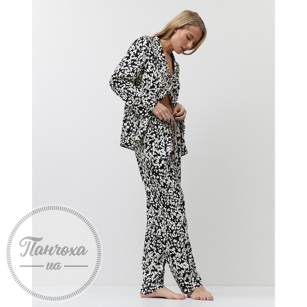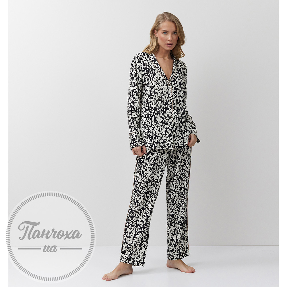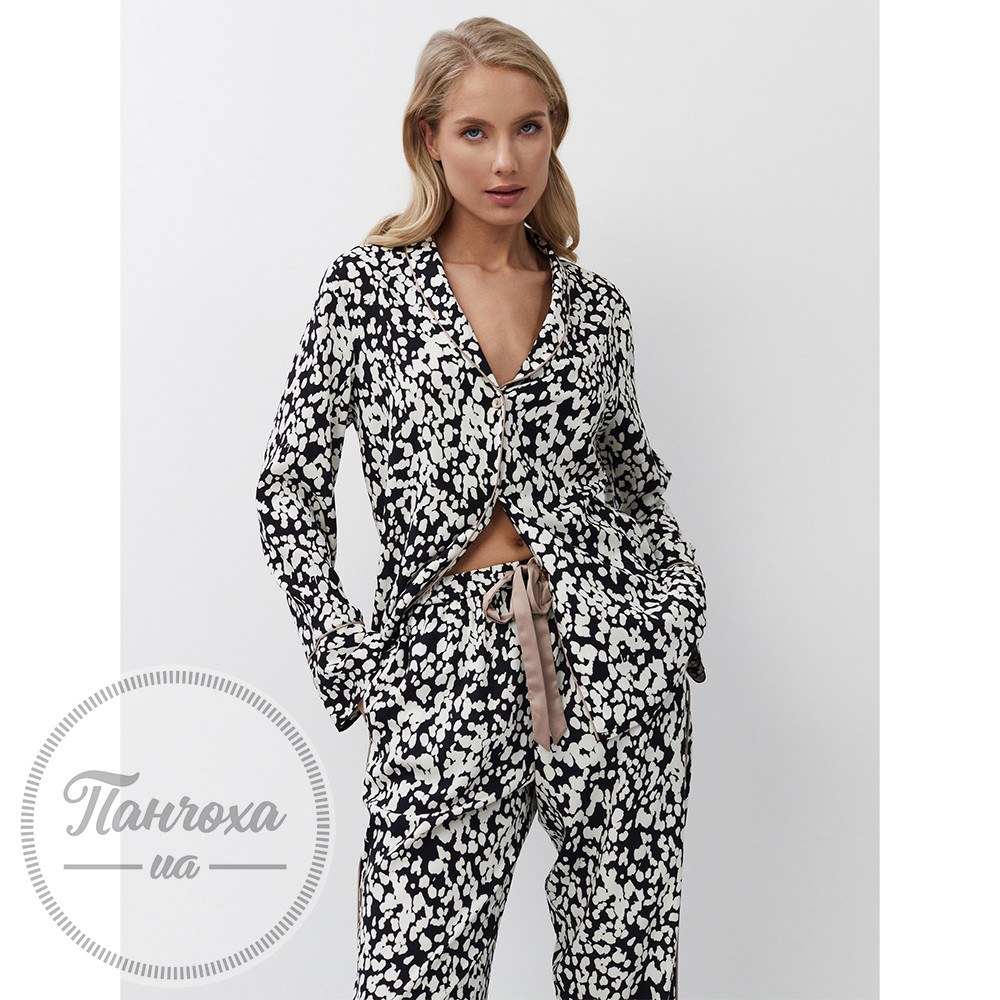 Класичний піжамний комплект зі штанами з безшовним візерунком у чорні та молочні крапки. Виготовлений із м’якої віскозної тканини.