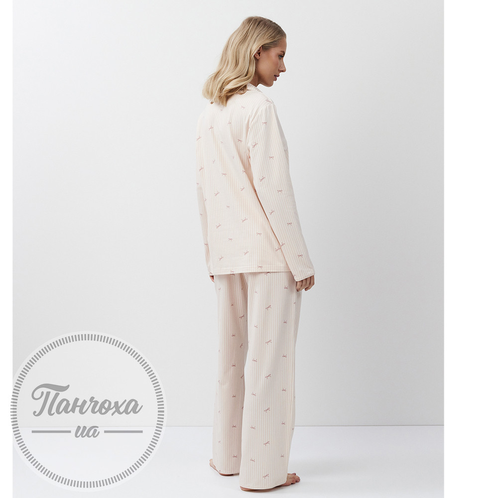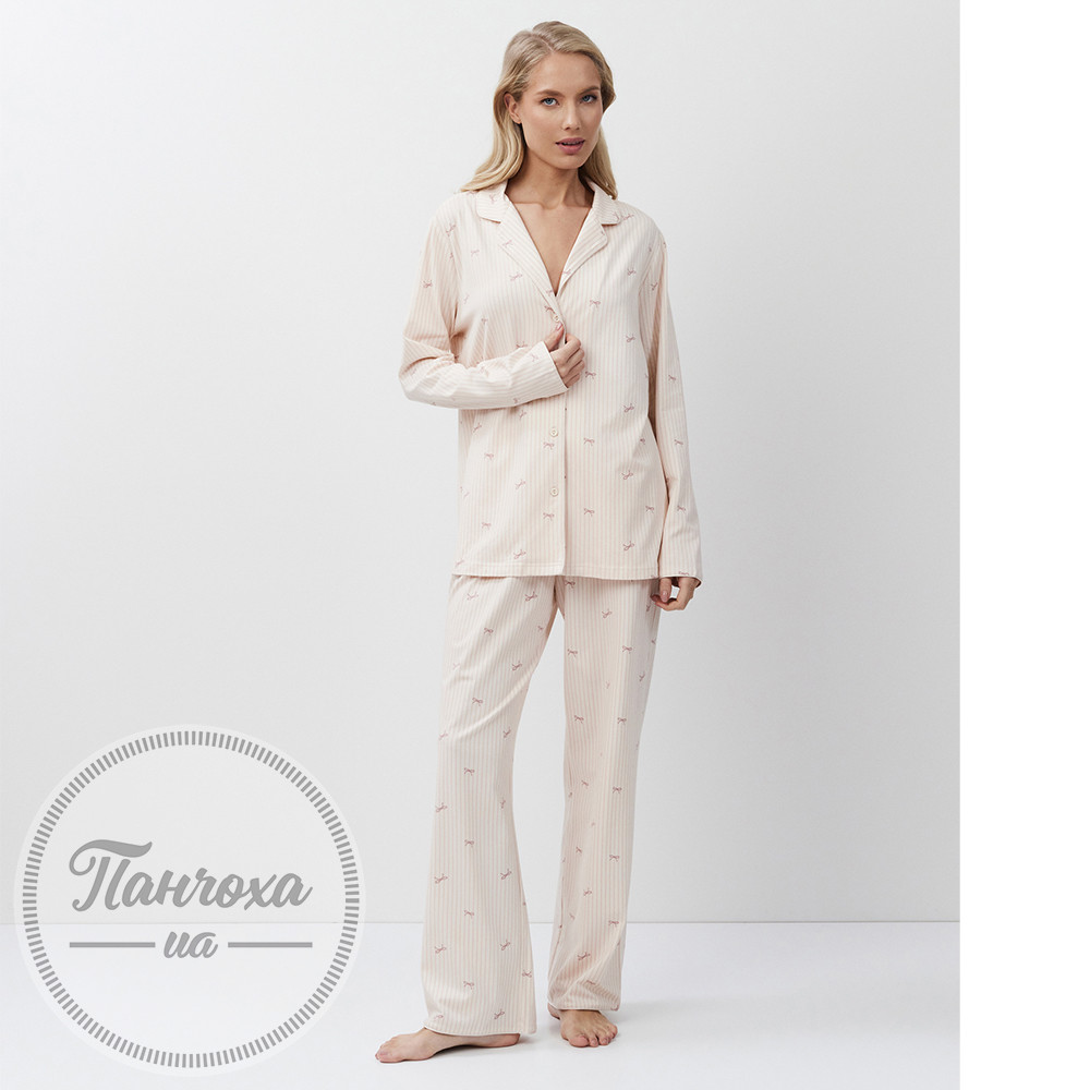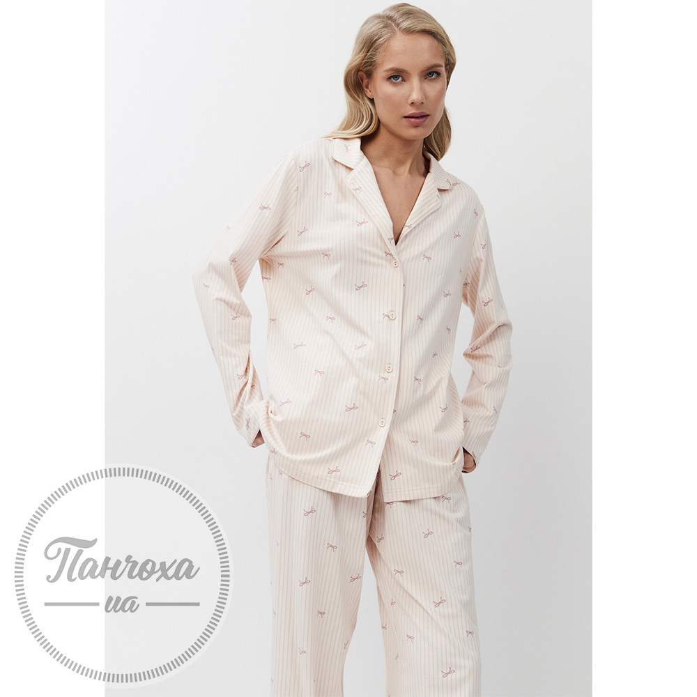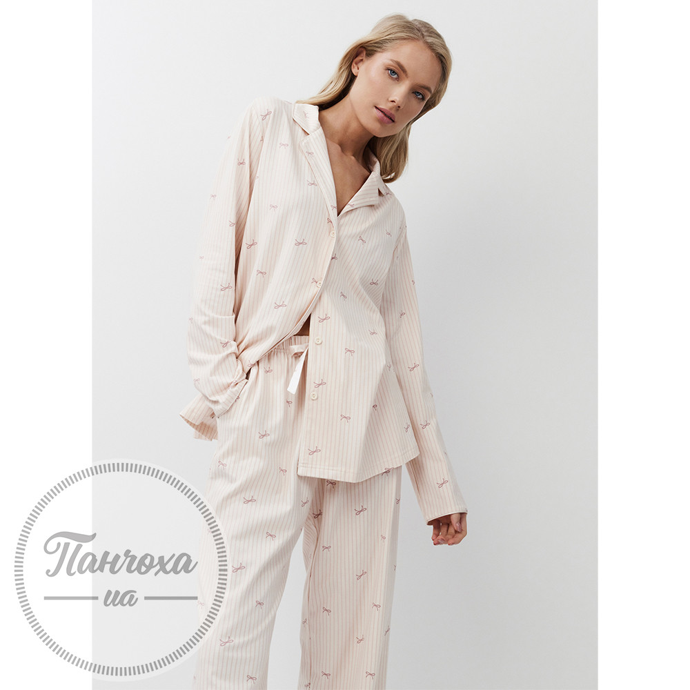 Елегантна піжама з ніжним бантиковим візерунком. Виготовлена з надзвичайно м’якої й розкішної бавовняно-модальної тканини, що забезпечує легкість і приємну гладкість на дотик. Смугастий принт із маленькими рожевими бантиками. Сорочка з легко oversize посадкою та класичним відкладним коміром. Контрастний кантик уздовж вирізу горловини, кишені, манжет і низу штанів для вишуканого вигляду. Прямі штани забезпечують розслаблений, але охайний силует. Регульований бантик на талії.