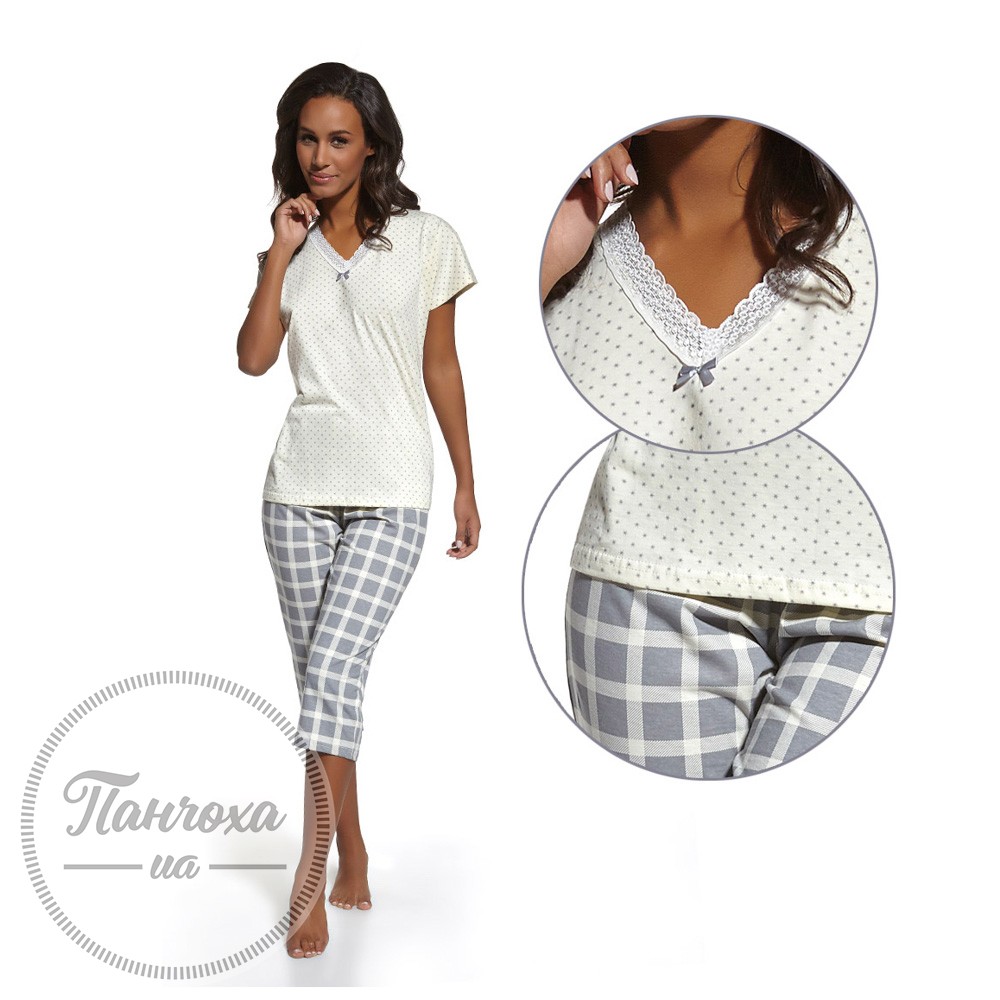 Піжама жіноча, виготовлена з високоякісної бавовни, м'яка та приємна на дотик, в комплект входять: футболка та капрі. Футболка оздоблена мереживом, капрі довжиною 3/4, широка комфортна резинка.