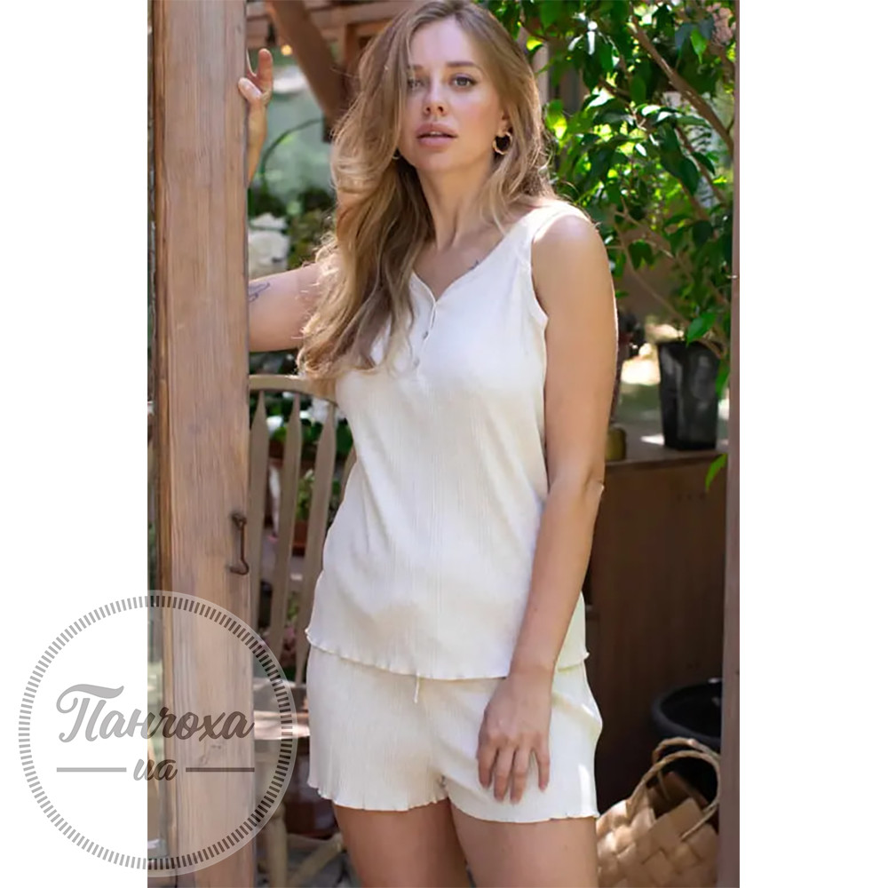 Майка з широким вирізом, що оздоблений ґудзиками та шорти прямого вільного крою, на зав'язках. У вишуканому вершковому кольорі.