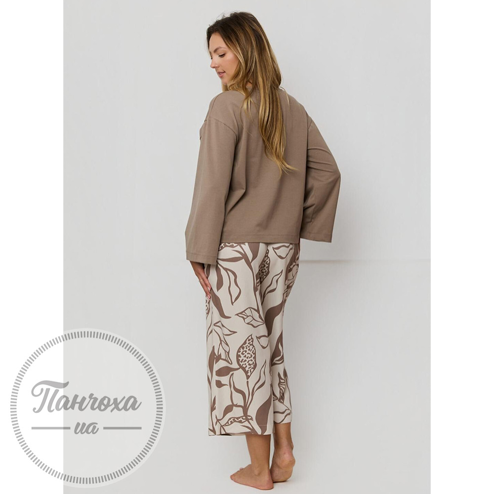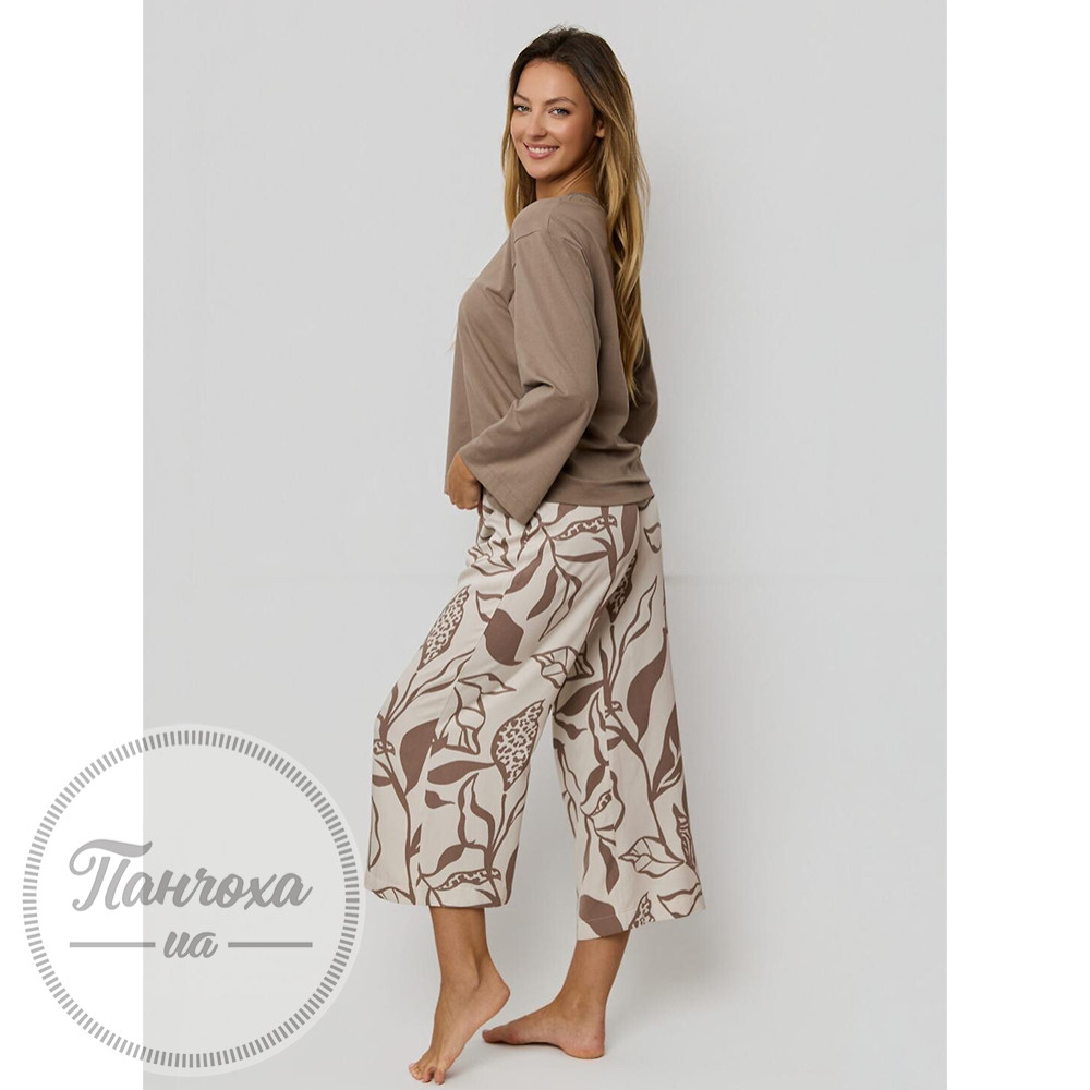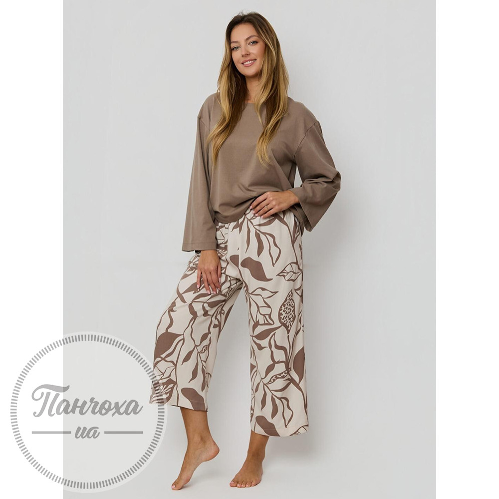 Жіноча піжама,виготовлена з високоякісного трикотажу. До складу входить футболка з міцної бавовни з круглим вирізом та довгими рукавами та вільні штани довжиною 7/8.