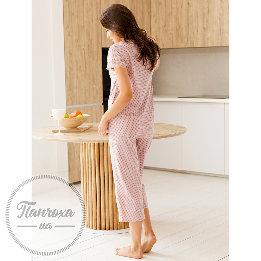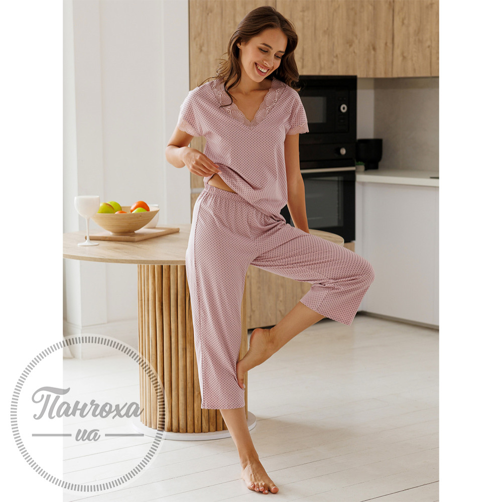Легкість, м’якість і комфорт – усе, що потрібно для гармонійного відпочинку. Цей комплект виготовлений із натуральної бавовни, яка дихає, ніжно торкається шкіри та дарує відчуття спокою у будь-яку пору року. Матеріал приємний на дотик і створює природний комфорт під час сну чи домашніх моментів. Верх із коротким рукавом і V-подібним вирізом прикрашений делікатним мереживом, яке додає жіночності та витонченості. Бриджі з м’яким еластичним поясом забезпечують зручну посадку та свободу рухів. Легкий силует дозволяє почуватися невимушено, зберігаючи акуратний вигляд. Ніжний рожевий колір із принтом "горох" створює атмосферу домашнього тепла й спокою. Комплект виглядає лаконічно, але водночас елегантно – саме те, що потрібно для вечірнього релаксу або затишного ранку.