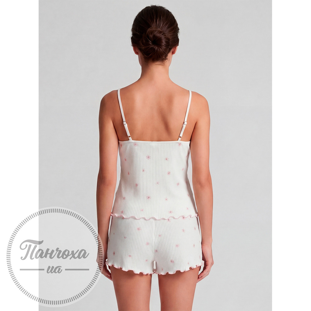 100% cotton. Жіноча піжама з принтом створена для тих моментів, коли хочеться максимального комфорту й легкості без зайвого. М’яка рібана приємно прилягає до тіла, повторює лінії фігури й дарує відчуття затишку без тиску чи дискомфорту. Натуральна бавовняна тканина добре пропускає повітря, дозволяє шкірі дихати та забезпечує комфорт як під час сну, так і під час домашнього відпочинку. Білий колір виглядає ніжно та свіжо, додає образу чистоти, а делікатний квітковий принт створює легкий і жіночний настрій. Майка на тонких бретелях акуратно підкреслює плечі та виглядає лаконічно, а шорти з еластичною посадкою не сковують рухів і забезпечують зручність протягом усього часу носіння. Хвилясті краї додають комплекту м’якого акценту й завершеного вигляду, роблячи його ще більш привабливим. Ця жіноча піжама поєднує в собі практичність і стиль, легко стає улюбленою річчю для дому та відпочинку. Ідеальний варіант для теплих вечорів і спокійних ранків, коли важливо відчувати себе комфортно в кожній деталі. Обери свій розмір і замовити та купити цей комплект можна онлайн, щоб додати у свій щоденний ритм ще більше ніжності та затишку. Відтінок тканини та принт можуть мати незначні відмінності від зображення на фото через особливості зйомки та індивідуальні налаштування передачі кольору на різних пристроях.