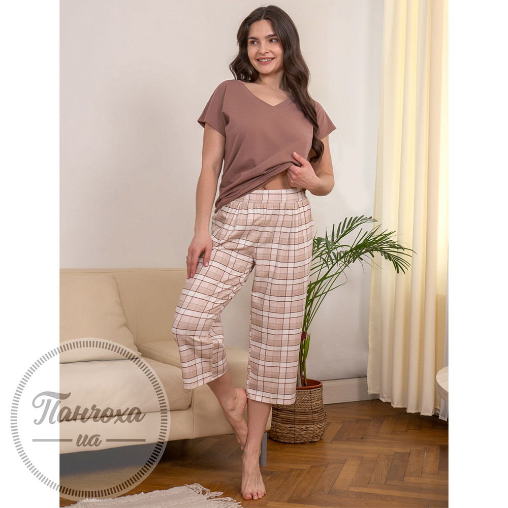 Домашній гардероб особливо цінується тоді, коли в ньому поєднуються свобода рухів, приємна фактура тканини та продумана, спокійна естетика. Представляємо жіночу піжаму Donna — врівноважена за настроєм, затишна у відчуттях та гармонійна візуально. Вона пасує для вечірнього відпочинку або неквапливого пробудження, коли домашні справи робиш у комфортному ритмі. Піжама для тих днів, коли хочеться побути в м’якому, дійсно красивому одязі і з повним комфортом. Комплект складається з однотонної футболки кавового кольору та бріджів у світлу клітинку. Таке поєднання виглядає цілісно й сучасно: верх додає глибини та тепла, а принтований низ вносить у образ нотку класичної домашньої естетики. Футболка має вільний крій і V-подібний виріз, завдяки чому виглядає легко й невимушено. Бріджи добре сідають по фігурі, не обмежують рухів і підкреслюють влучний дизайн комплекту. Клітинка тут асоціюється зі стабільністю, впорядкованістю та звичним домашнім комфортом, тоді як однотонний кавовий верх дає м’який, теплий контраст. Бавовна дарує приємний контакт зі шкірою, добре пропускає повітря й дозволяє тілу повністю розслабитися. Це піжама з бріджами, яка легко стає частиною повсякденного домашнього ритуалу. Для тих, хто шукає жіночий бавовняний одяг для дому у спокійній, елегантній палітрі, цю модель точно варто замовити та купити як основу вашої домашньої моди. Відтінок тканини може мати легкі відмінності від зображення через особливості фото та передачі кольору на різних пристроях.