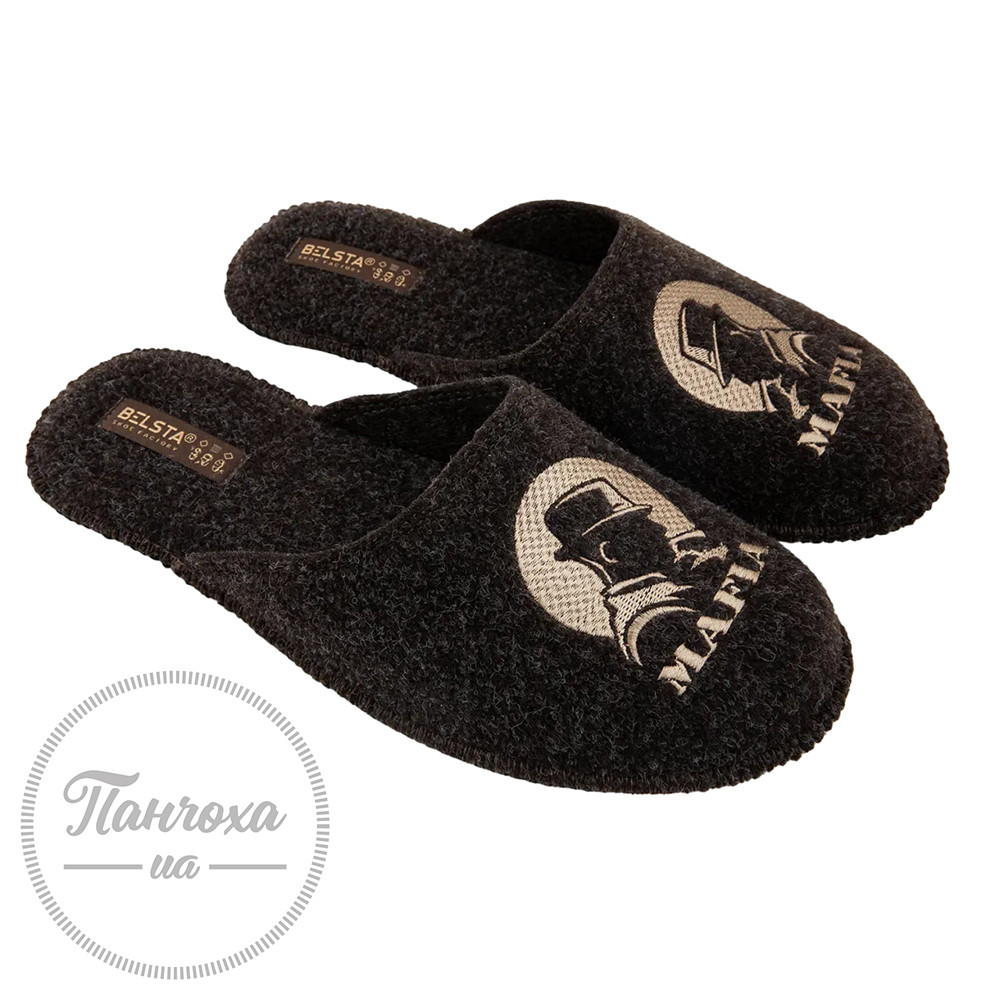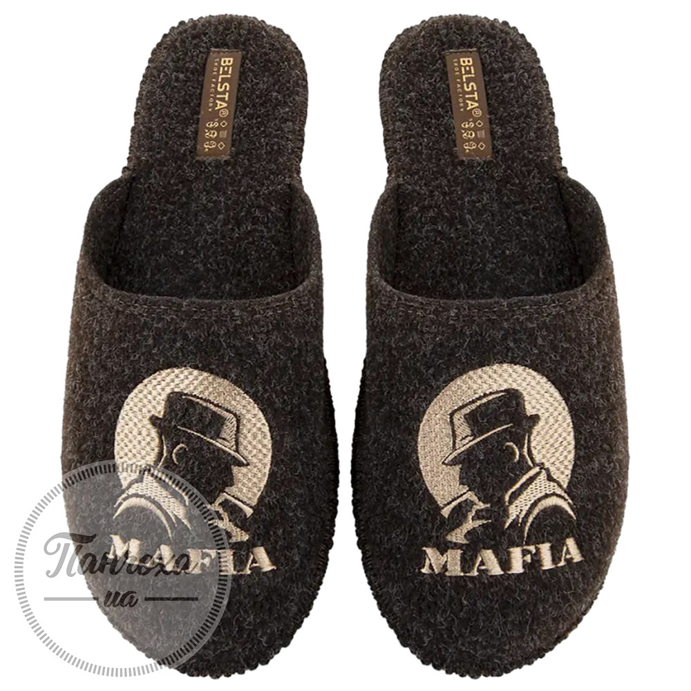Чоловічі капці української фабрики БЕЛСТА з повсті, прикрашені вишивкою у вигляді MAFIOZI. Безпідошовні, на підошовну частину нанесено шовкотрафаретний друк із пластизольної фарби, що перешкоджає ковзанню.