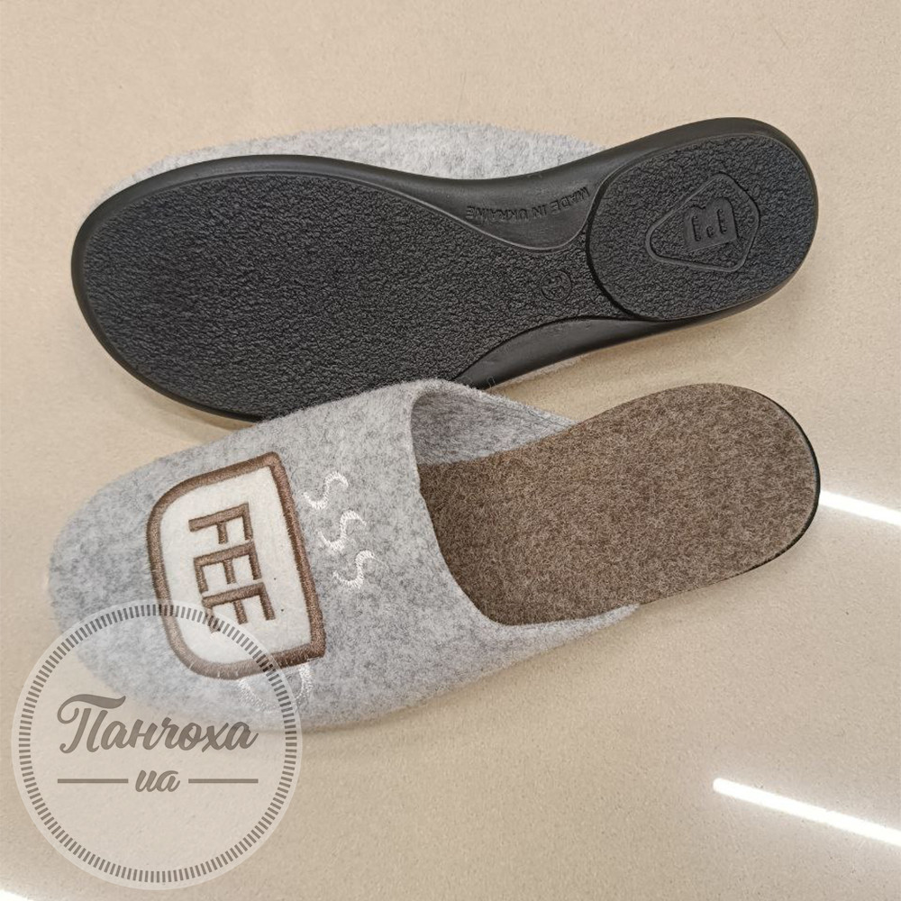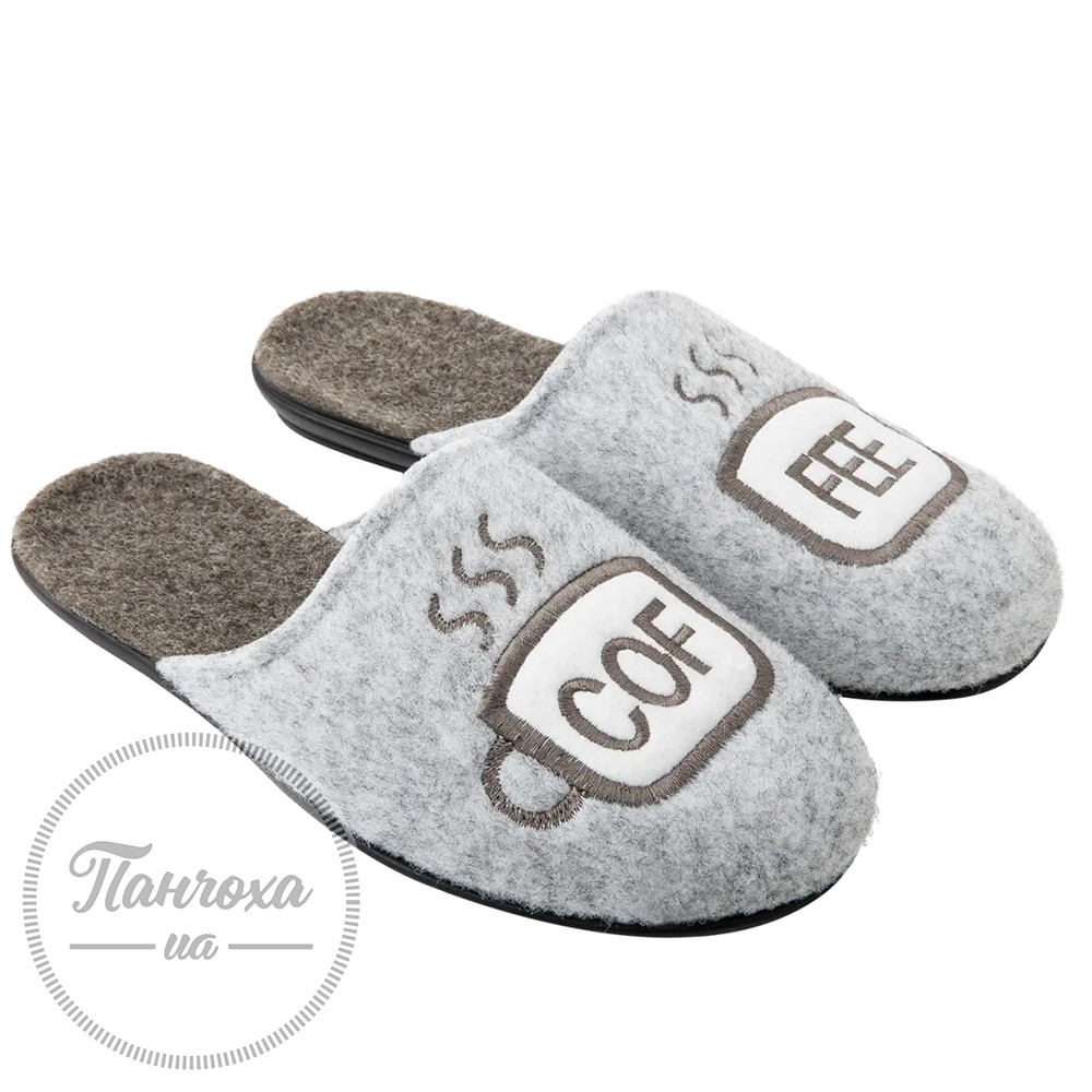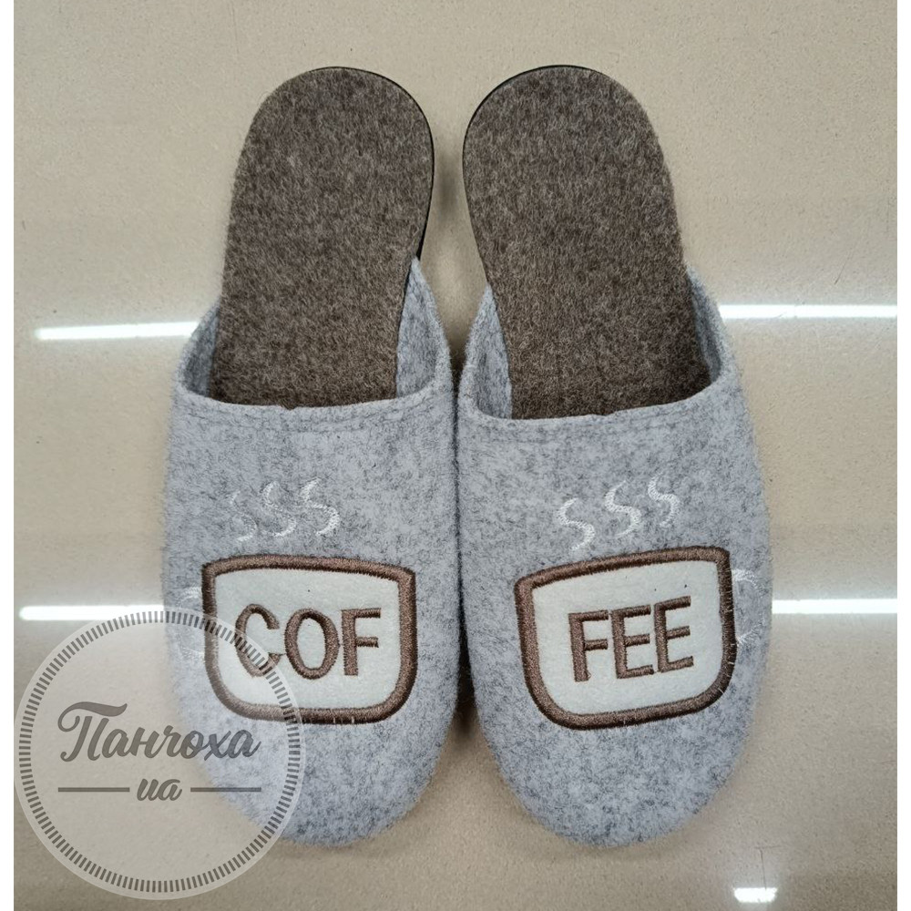 Жіночі закриті капці БЕЛСТА із світло-сірої італійської повсті, прикрашені оригинальною вишивкою COFFEE. Устілка зроблена з теплої бежевої повсті. Модель підходить для носіння в демісезонний та теплий періоди.Повномірна модель, не вузька, з округлим носком.