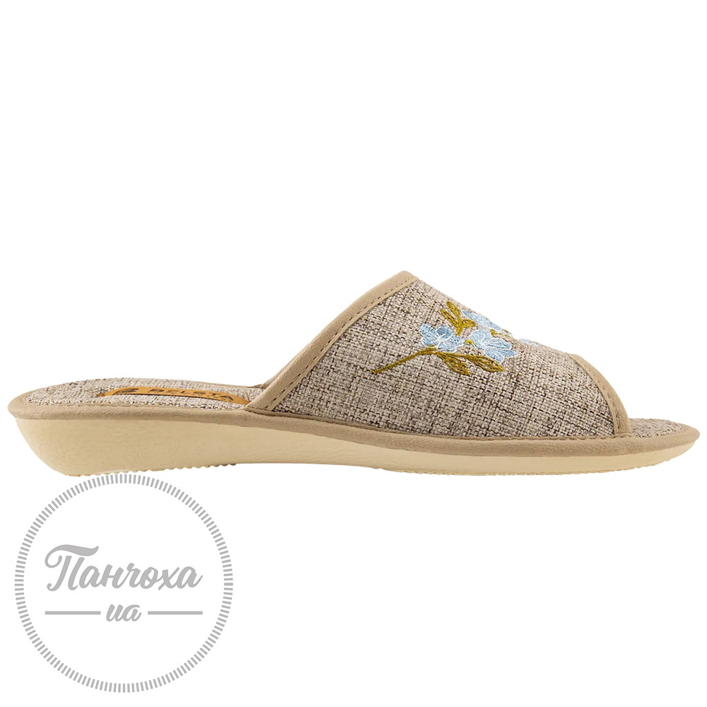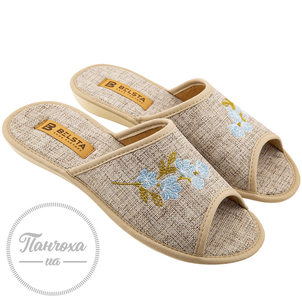 Жіночі відкриті капці БЕЛСТА з бежевого текстилю, прикрашені квітковою вишивкою. Устілка зроблена з текстилю. Модель підходить для носіння у теплий та демісезонний періоди. Підошва: поліуретан; Висота підошви: 2 см.