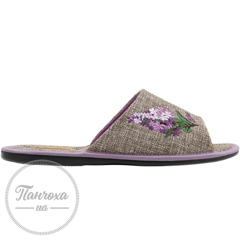 Жіночі відкриті капці БЕЛСТА з бежево-серого текстилю, прикрашені вишивкою у вигляді гілочки Бузку. Устілка: текстиль; Підошва: поліуретан; Висота підошви: 1 см.