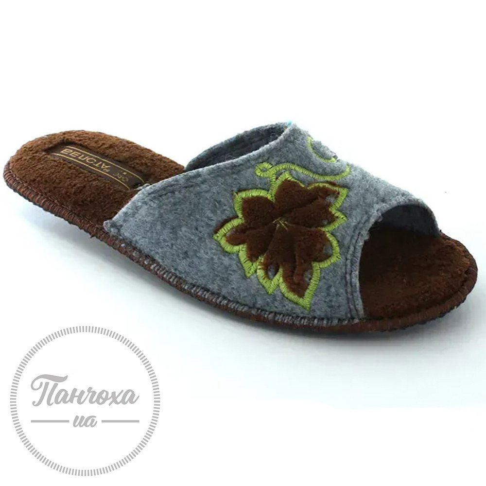 Жіночі відкриті капці БЕЛСТА з сірої повсті, прикрашені вишивкою у вигляді виноградного листа. Устілка зроблена з махри коричневого кольору. Модель підходить для носіння в демісезонний період. На підошовній частині є опукле нанесення пластизольною фарбою, яке запобігає ковзанню.