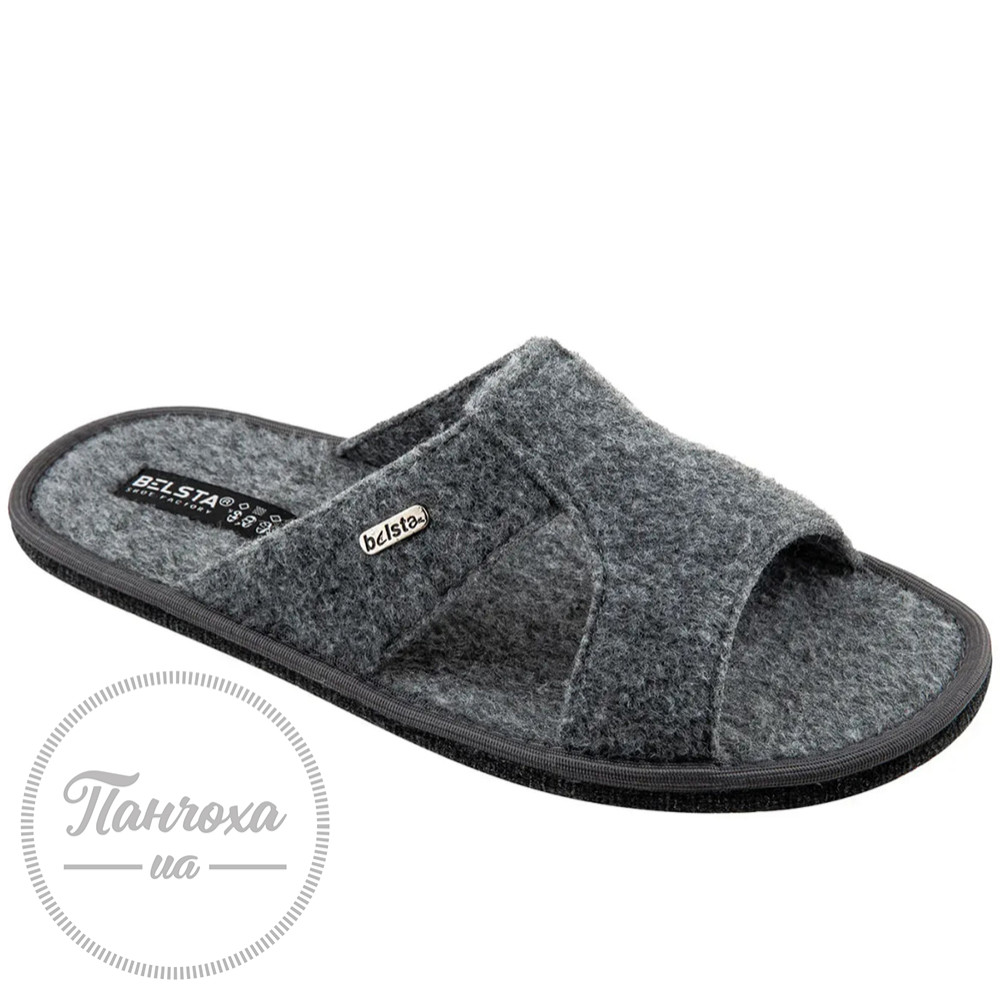 Мужские открытые войлочные тапочки украинской фабрики БЕЛСТА, украшенные логотипом фабрики. Бесподошовная, на подошвенную часть нанесена шелкотрафаретная печать из пластизольной краски, препятствующей скольжению.