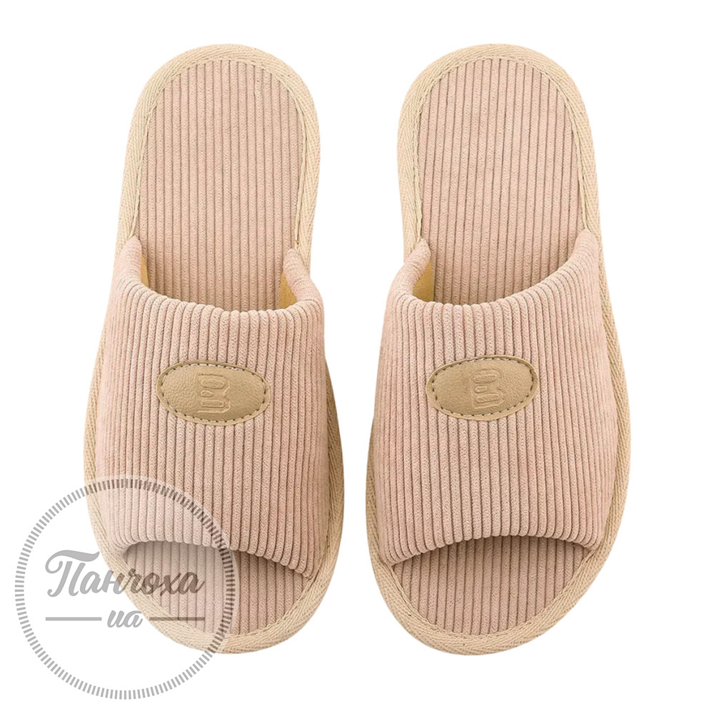 Женские открытые тапочки БЕЛСТА из вельвета, украшенные вставкой из бежевой эко кожи с логотипом фабрики. Стелька: вельвет, подошва: полиуретан, высота подошвы: 1 см.