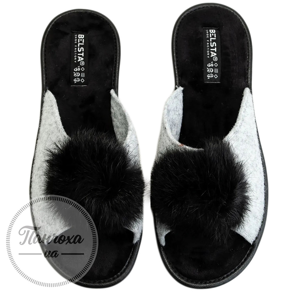 Женские открытые тапочки БЕЛСТА из итальянского серого войлока, украшенные натуральным черным мехом.Такие тапочки словно обнимают ногу, создавая ощущение невесомости. Велюровая стелька обеспечивает ногам мягкую поддержку и комфорт, что особенно важно, если вы проводите много времени на ногах. Стелька не скользит по полу благодаря полиуретановой подошве, что делает их безопасными.