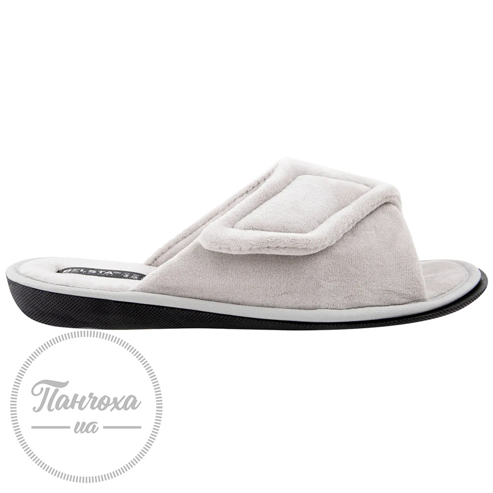 Женские открытые тапочки БЕЛСТА из велюра светло-серого цвета, с текстильной застежкой-липучкой.